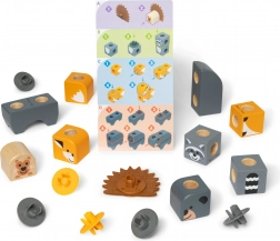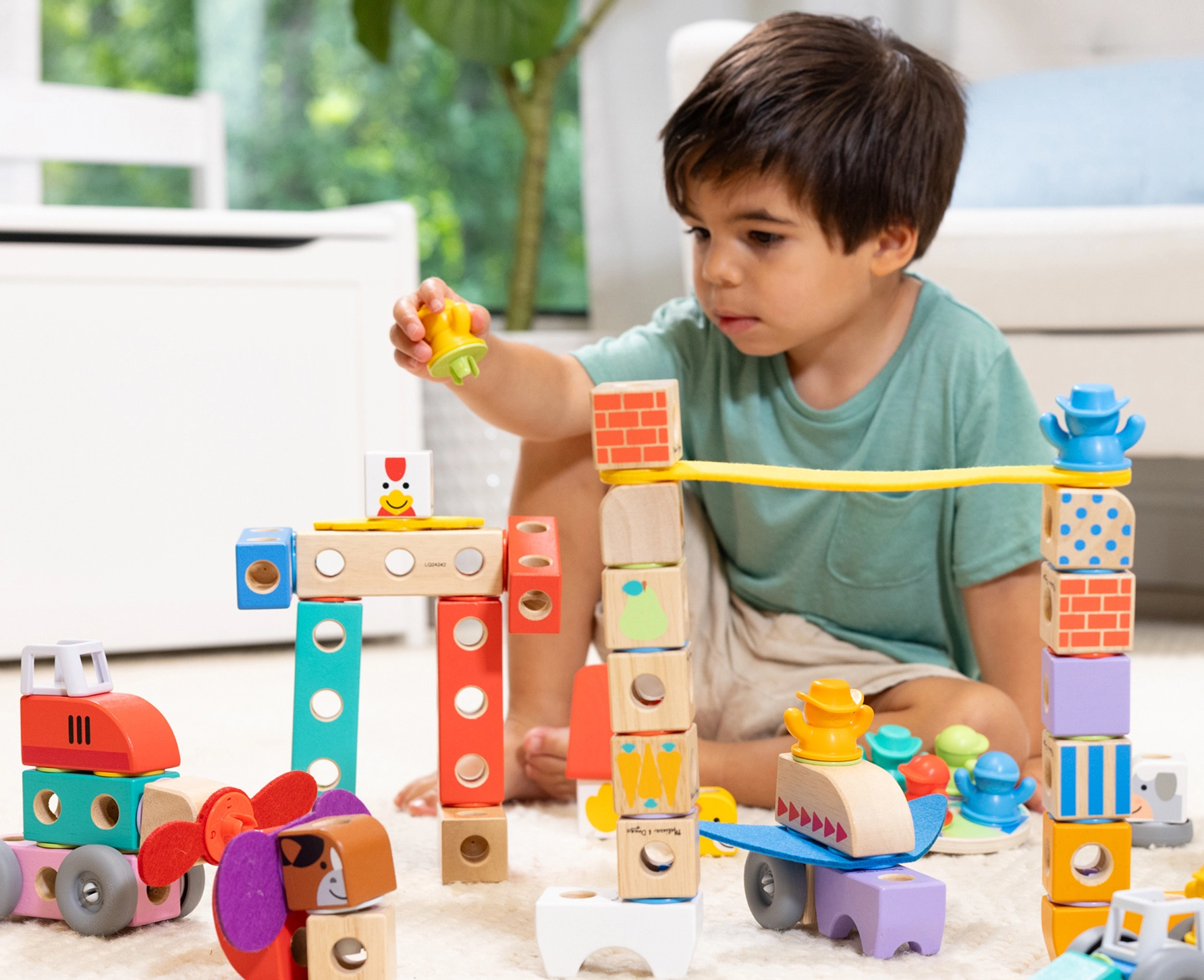Des blocs illustrés avec ouvertures et connecteurs invitent au tri, à l’enfilage et à l’appariement. Les enfants exercent la reconnaissance des formes et des motifs ainsi que la motricité fine.