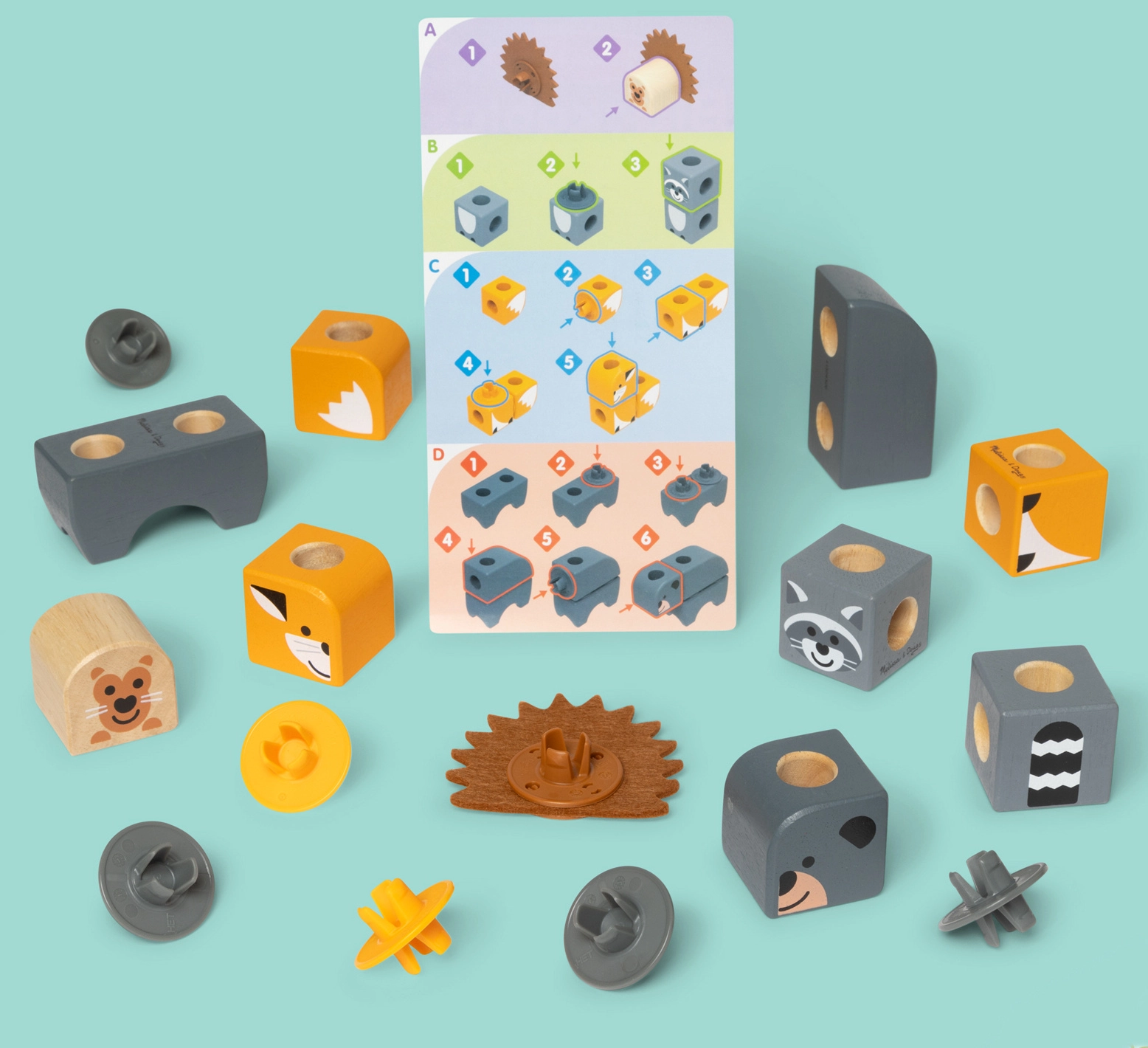 Les pièces imprimées avec des visages et corps d’animaux se combinent en adorables personnages et créations originales. Favorise l’imagination et le jeu autonome.