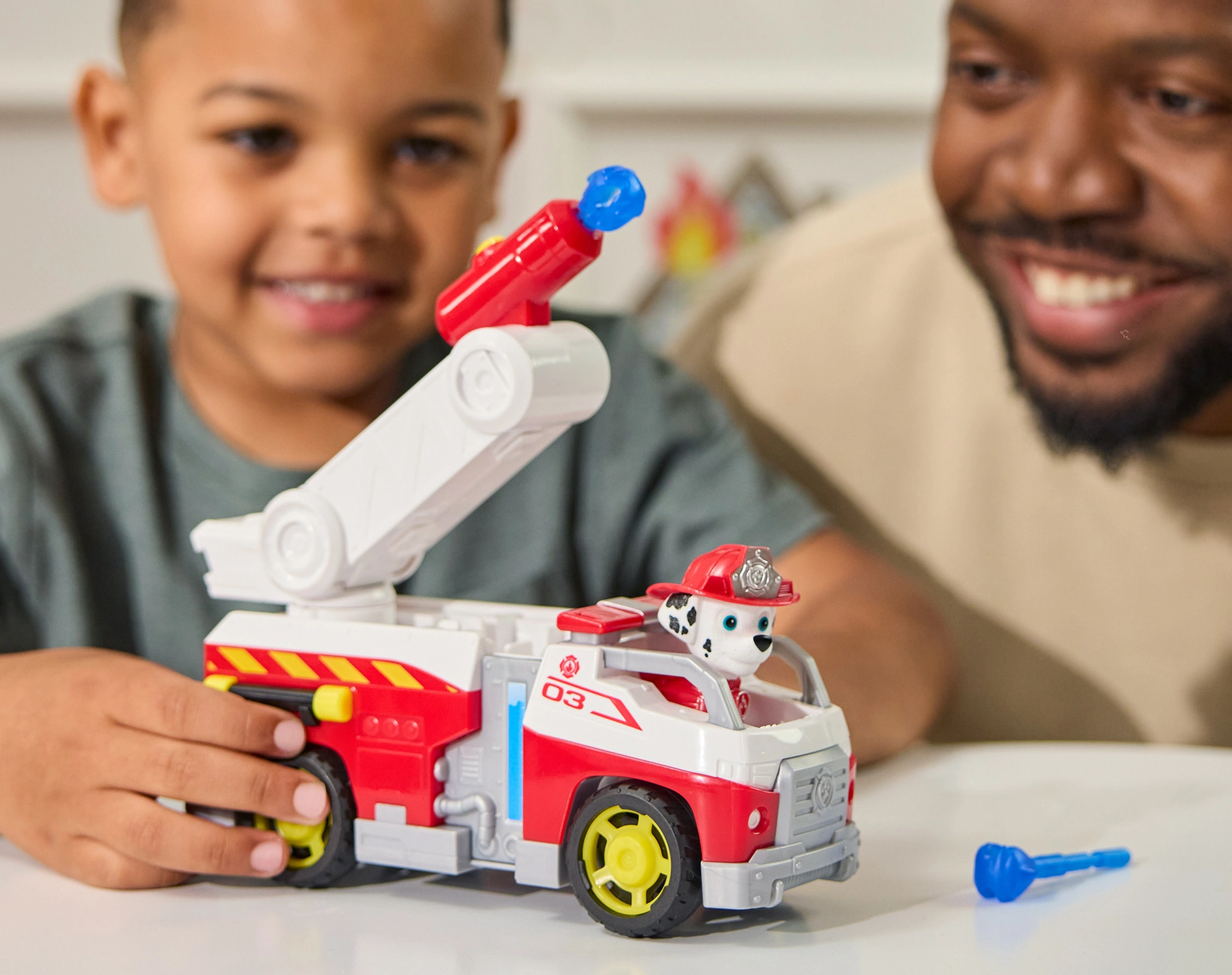 Découvrez le dalmatien préféré Marshall et son superbe camion de pompiers inspiré de la série PAW Patrol. Les enfants peuvent asseoir la figurine dans la cabine et foncer vers l’intervention, lever l’échelle et utiliser le canon pour tirer des projectiles bleus « eau » sur des flammes imaginaires. Ce jouet stimule l’imagination, la motricité fine et le jeu thématique de sauvetage.