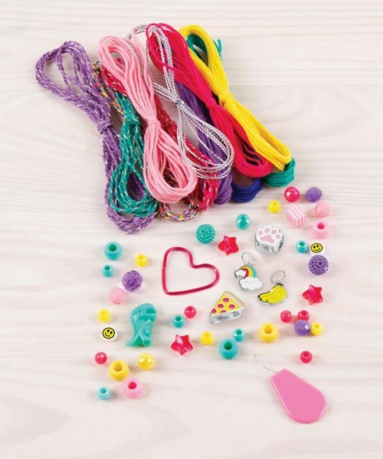7 fils de coton colorés, un cordon métallisé argenté, 3 cordons colorés, des perles, des breloques et des instructions claires – vous pouvez commencer à créer immédiatement.