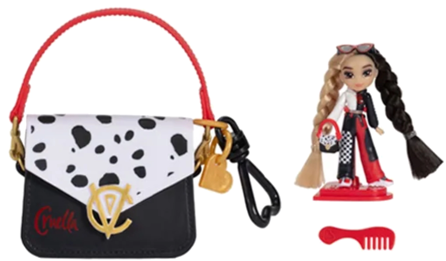 Découvrez la ravissante mini poupée de la série Disney ILY 4Ever inspirée de Cruella des 101 Dalmatiens. Tenue stylée noir‑rouge‑blanc à pois, cheveux bicolores, petites baskets et pratique sac rose pour transporter tout le set. Inclus aussi un peigne, des lunettes et un support pour l’exposer – un cadeau parfait pour les jeunes amateurs de la magie Disney.