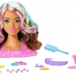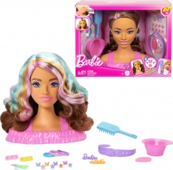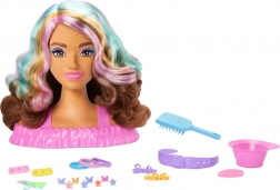 La tête à coiffer BARBIE offre aux enfants d’innombrables possibilités de création de coiffures. Les longs cheveux bruns avec des mèches roses, orange et turquoise tiennent bien en place et invitent au tressage, fixation et embellissement. Une touche de magie s’ajoute avec les barrettes et les lèvres à changement de couleur après application d’eau et de l’éponge.