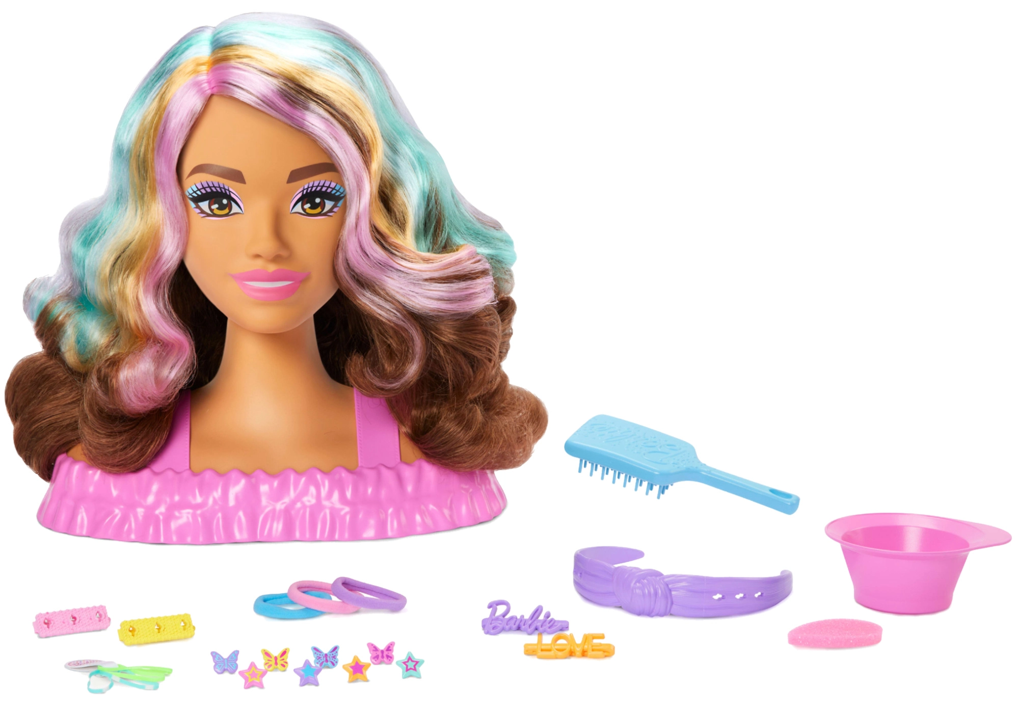 Brosse, serre-tête, élastiques, pinces, bol et décorations en forme d’étoiles et de papillons – tout pour des coiffures infinies.