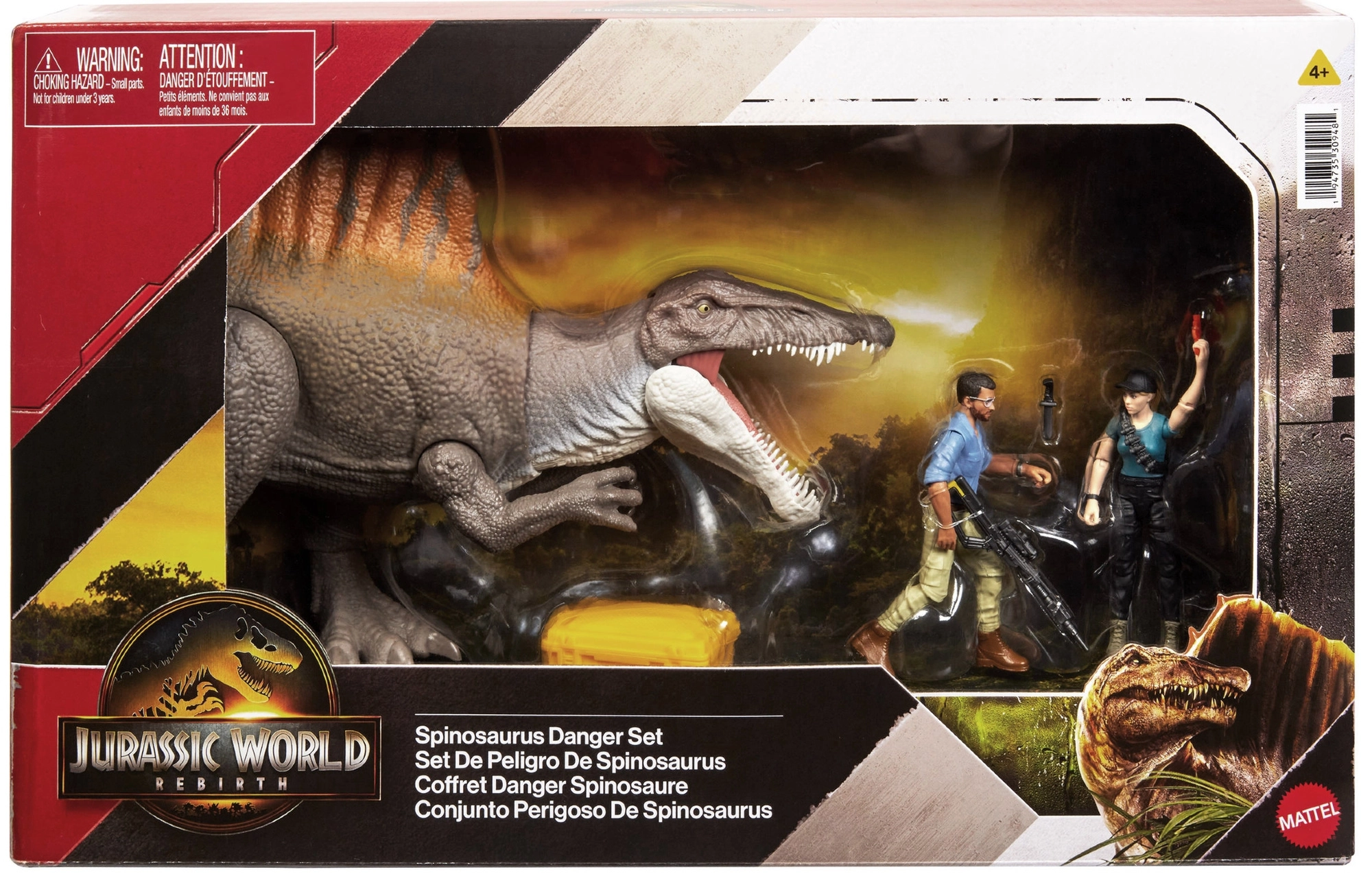 - Figurine Spinosaurus, 2 figurines humaines, accessoires (blaster/outils), caisse de transport jaune