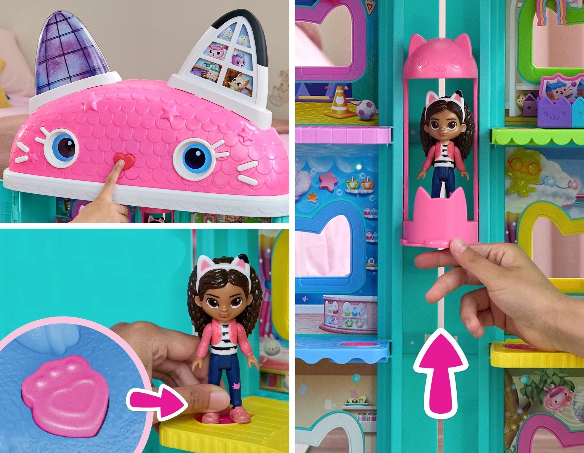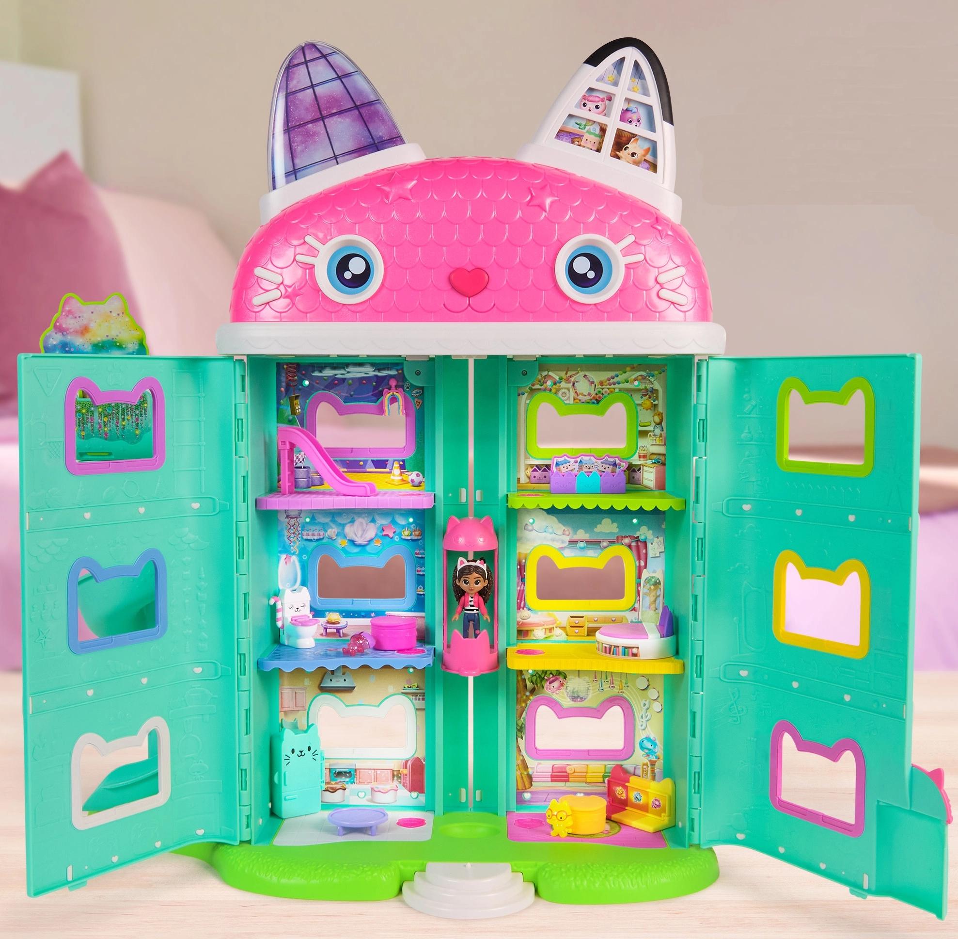 La grande maison des chats inspirée de la série GABBY’S DOLLHOUSE plonge les enfants dans un monde féerique. Cette maison ouvrante au toit iconique en forme de chat propose 6 zones de jeu, un ascenseur central fonctionnel, un toboggan en spirale et une joyeuse tour de livraison pour les colis. En touchant le nez, la maison déclenche 3 sons et phrases et jusqu’à 11 mélodies du film (en anglais).