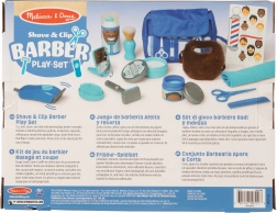 Tondeuse de barbier, ciseaux, peigne, blaireau de rasage, mousse et miroir permettent d’imiter fidèlement les gestes effectués dans un vrai salon.