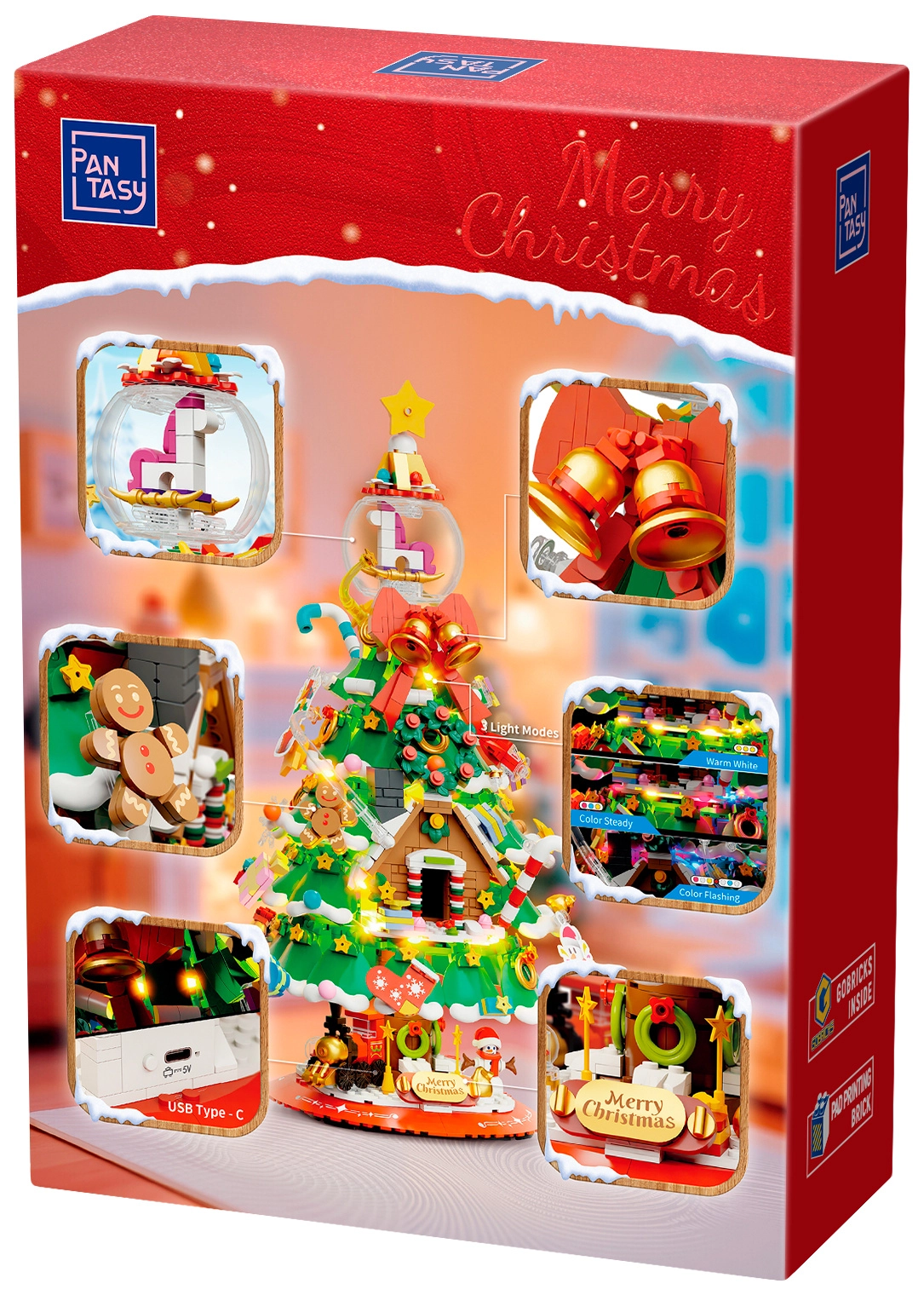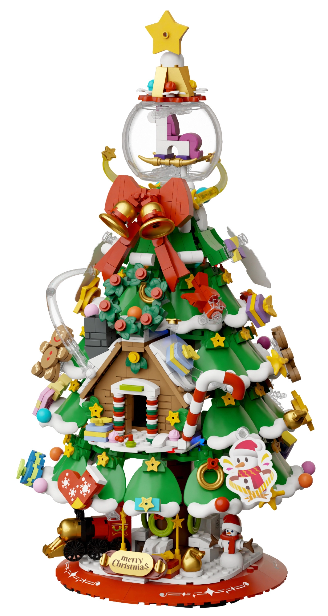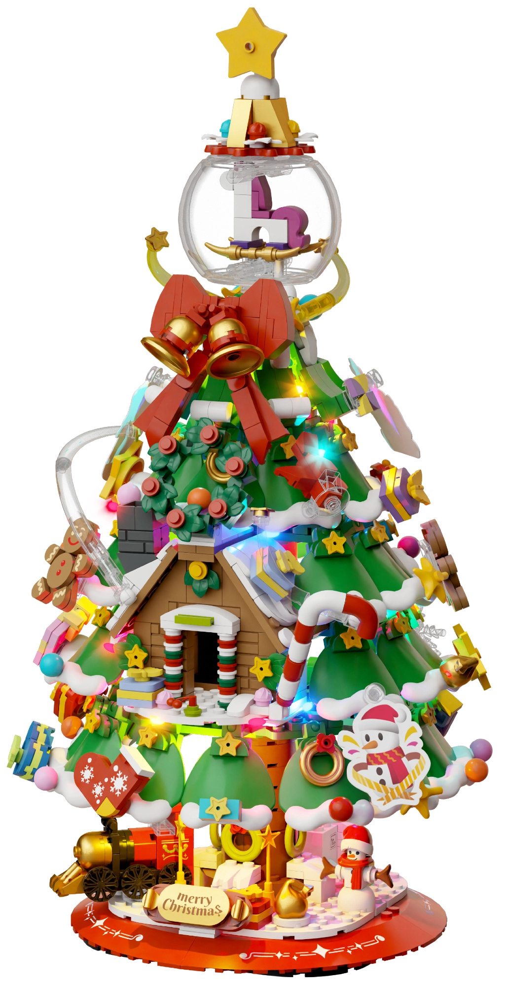 Ce sapin de Noël élégant en briques deviendra la pièce maîtresse de votre table de fête comme de votre salon. Il ne manque pas de détails enchanteurs tels qu’un mini train, un bonhomme de neige, une maison en pain d’épice, des clochettes et un petit bonhomme en pain d’épice. Au sommet brille une sphère cristalline avec un cheval à bascule, avec un couvercle transparent pour la protection et un rendu visuel spectaculaire.