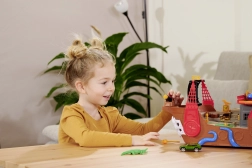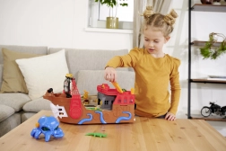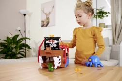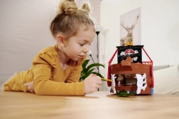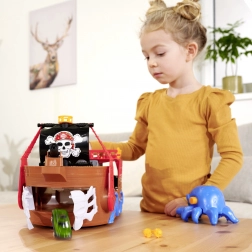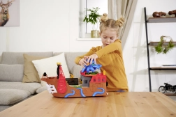 Ce bateau pirate richement détaillé est un véritable centre de divertissement. En soulevant le pont, on révèle une piste intégrée pour petite voiture métallique, où, grâce aux leviers et commutateurs, vous choisissez si le véhicule s’élance à travers la porte en forme de squelette, finit en prison ou est catapulté depuis le radeau. Un canon fonctionnel, un coffre au trésor, des tonneaux, un crocodile et d’autres accessoires stimulent le jeu imaginatif.
