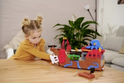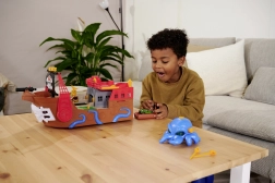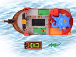 La pieuvre détachable s’illumine et émet des sons. Avec ses tentacules, elle saisit la petite voiture ou les accessoires, ajoutant une tension pirate aux histoires.