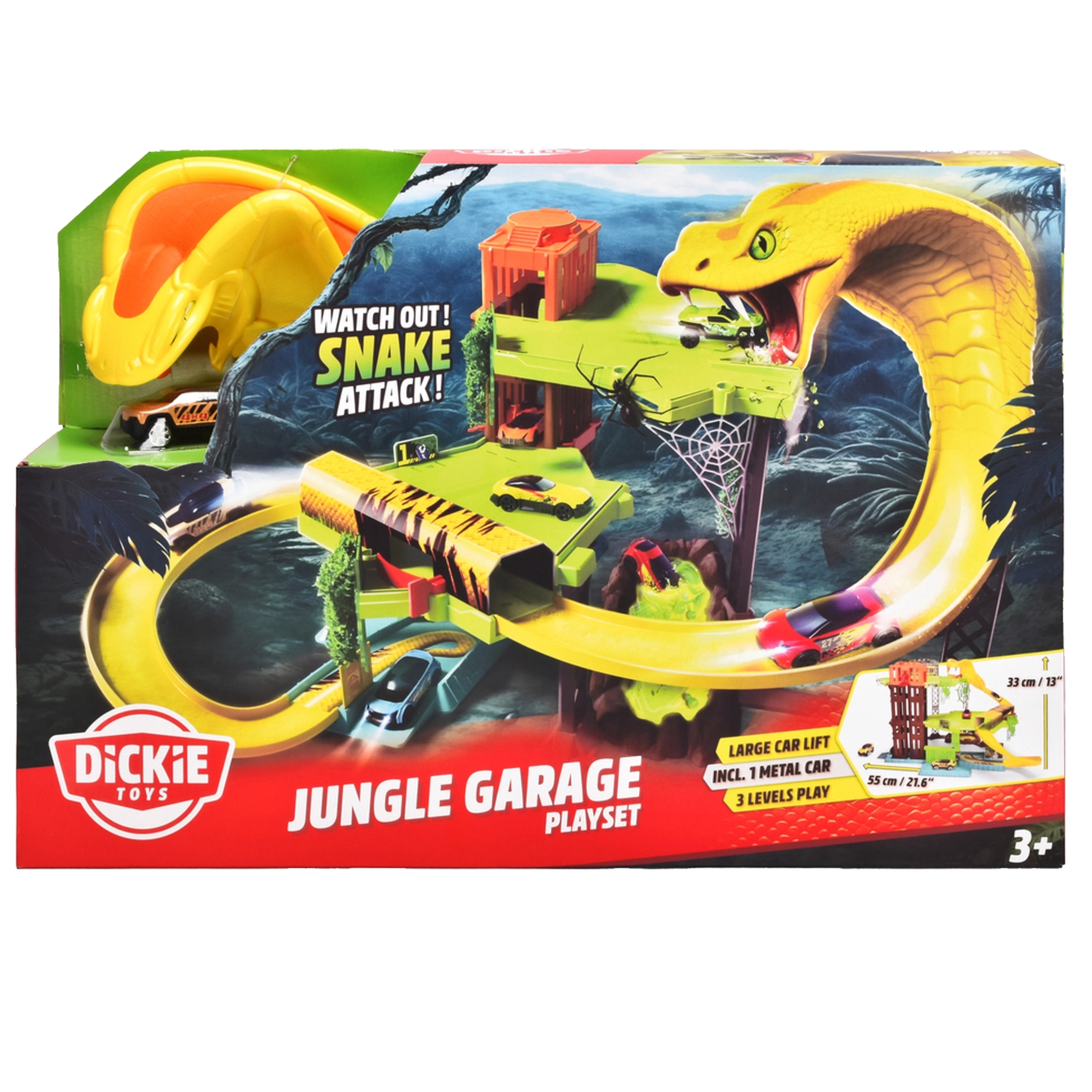 Partez pour une course palpitante à travers la jungle et explorez les trois niveaux du circuit, où un serpent géant vous guette. Le circuit Dickie Toys est conçu pour un jeu dynamique avec des descentes et montées fluides, et grâce à son ascenseur mobile, vous déplacez facilement la petite voiture entre les étages.