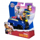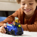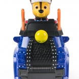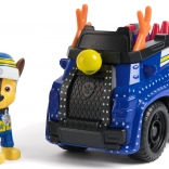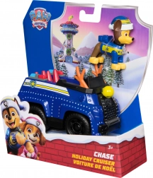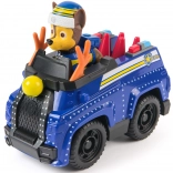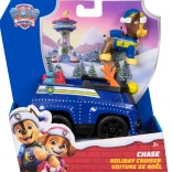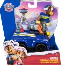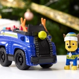 Voiture bleue détaillée avec éléments de Noël et roues mobiles. La figurine CHASE avec bonnet d’hiver est assise directement dans le cockpit et prête pour l’action.