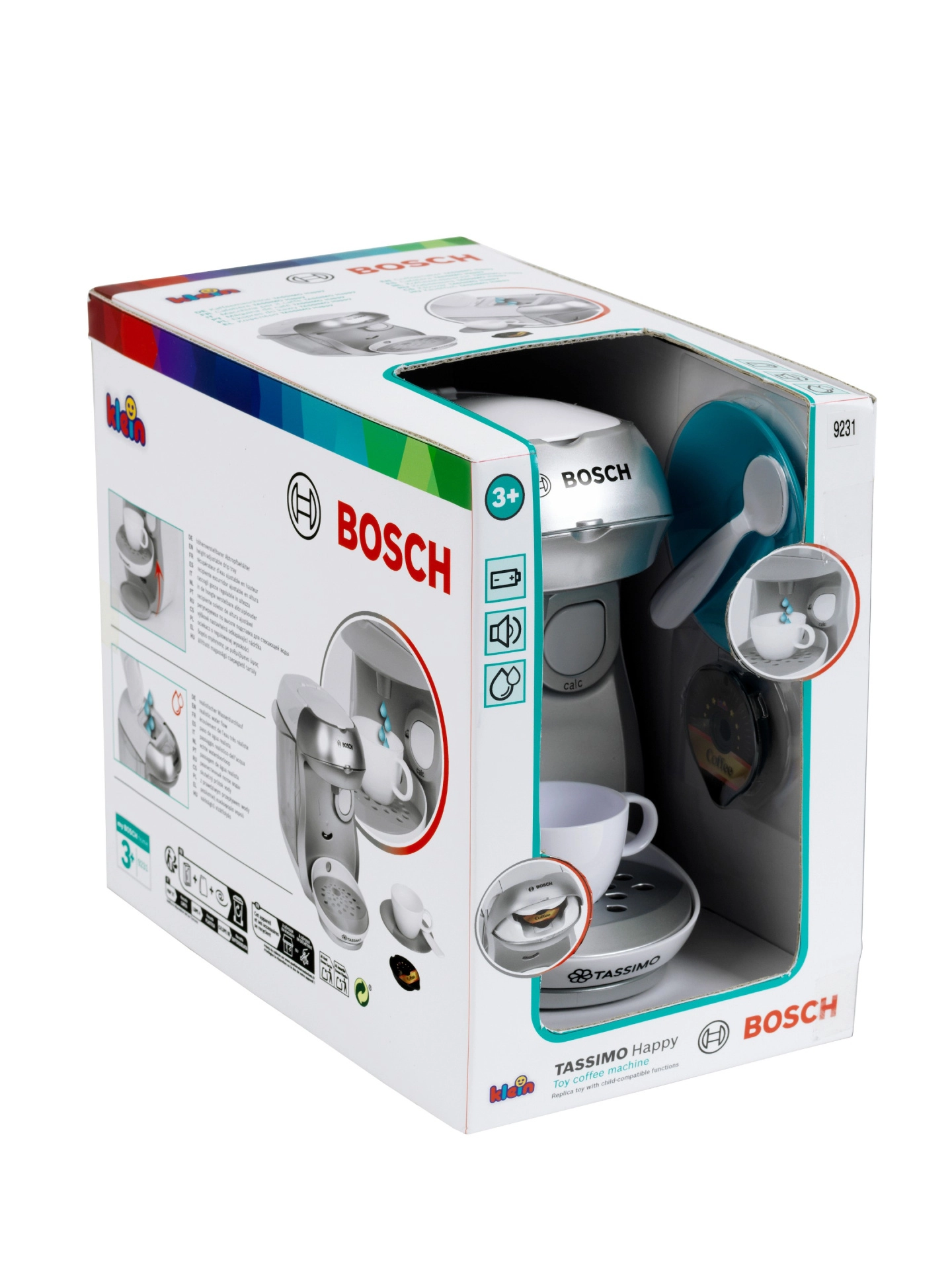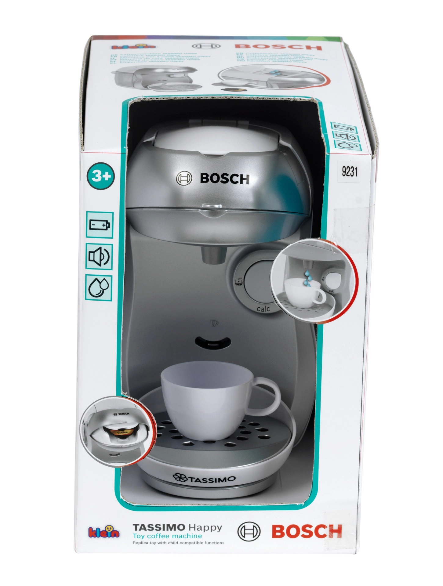La cafetière réaliste pour enfants TASSIMO BOSCH de la marque Klein ravira les petits baristas avec ses fonctions authentiques. Elle dispose d’un couvercle supérieur ouvrant pour capsules, d’un plateau d’égouttage, d’un véritable écoulement d’eau et d’effets sonores imitant le fonctionnement réel. Sont inclus tasse, soucoupe, cuillère et capsules pour un jeu sûr et créatif.