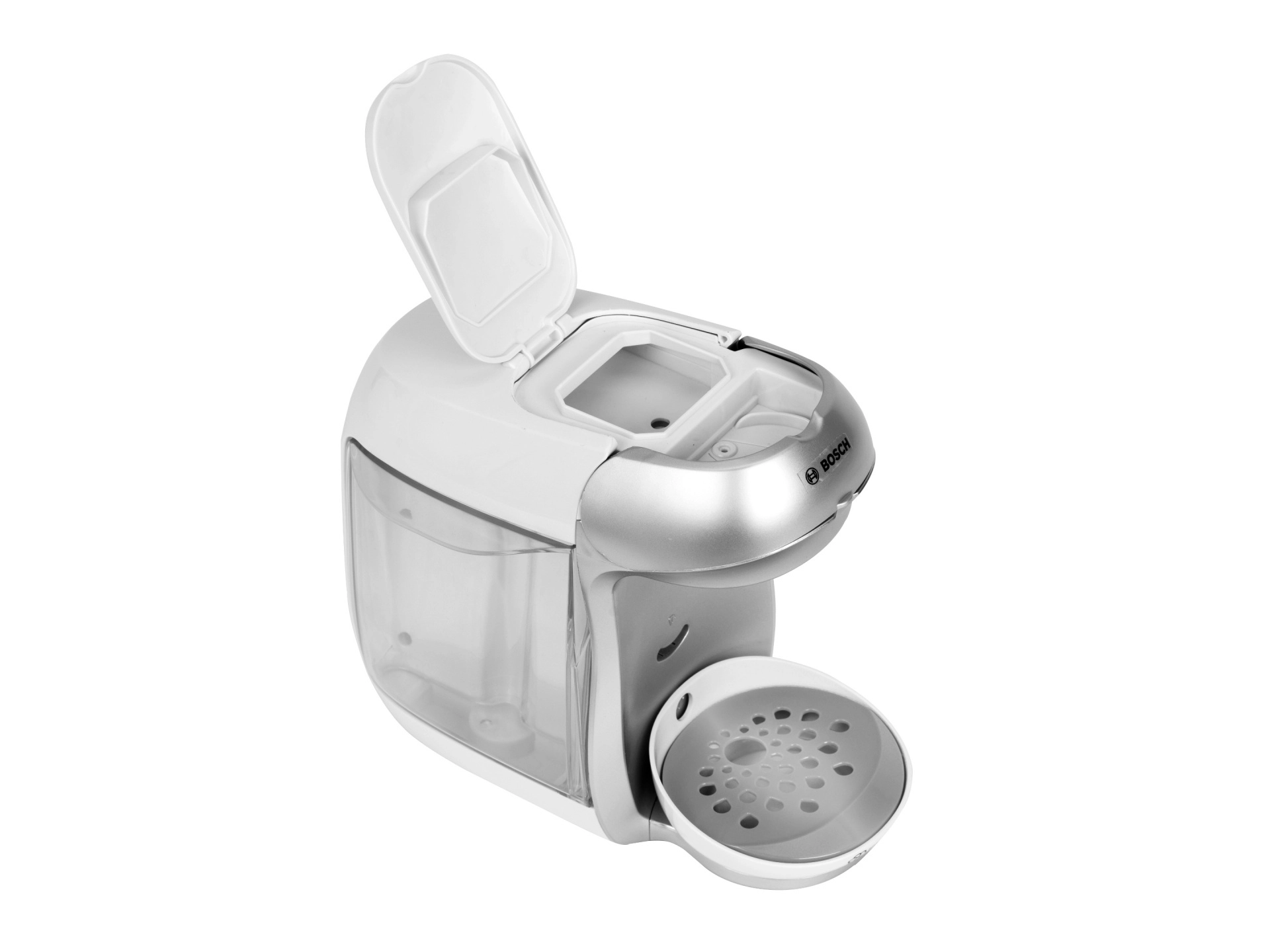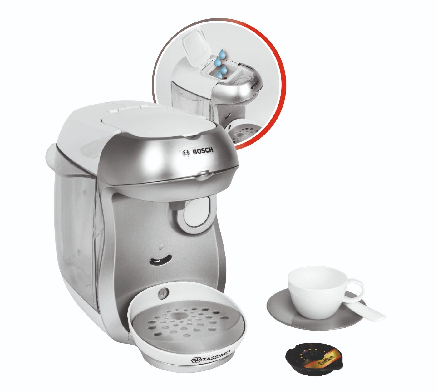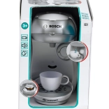 La cafetière pour enfants TASSIMO BOSCH, en blanc et argent, reproduit fidèlement un véritable appareil tout en étant entièrement sûre pour les enfants. Il suffit de verser de l’eau dans le réservoir, d’insérer une capsule sous le couvercle supérieur et d’appuyer sur le grand bouton start/stop – la machine déclenche un écoulement d’eau et ajoute des sons authentiques pour une expérience de jeu encore plus réaliste.