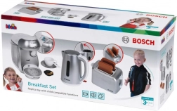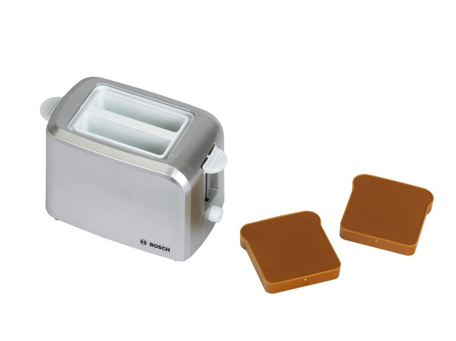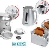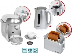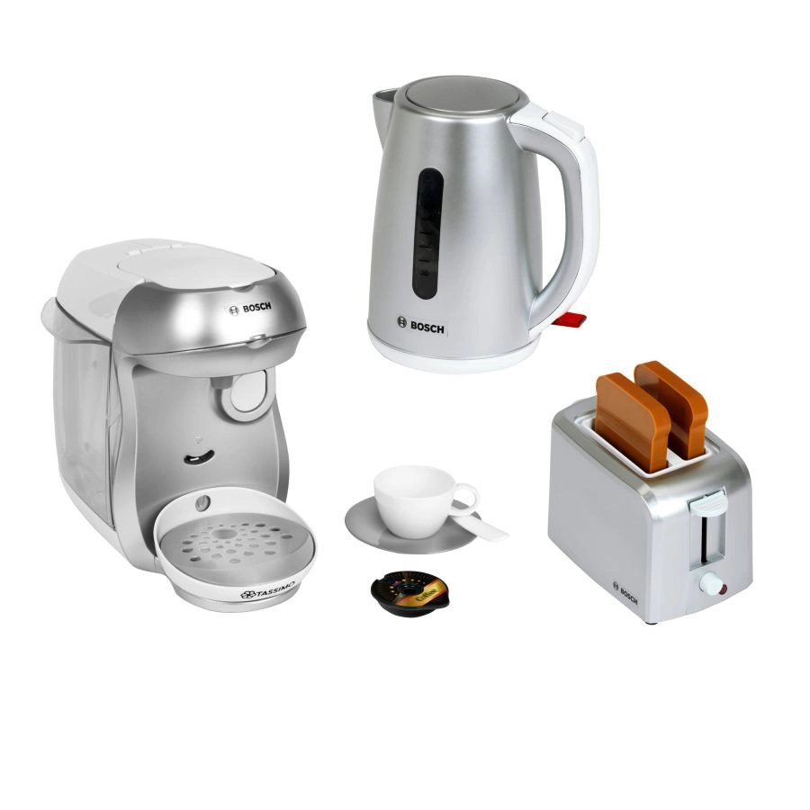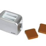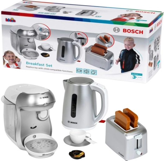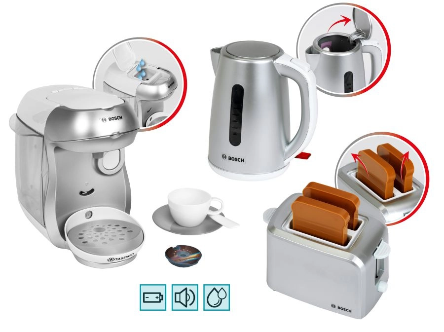 Le set comprend également un grille-pain compact gris avec éjection automatique de deux toasts, mécanisme de levage et molette imitant la régulation. Le tout est complété par une bouilloire électrique pour enfants avec couvercle ouvrant et interrupteur pour un jeu encore plus réaliste.