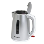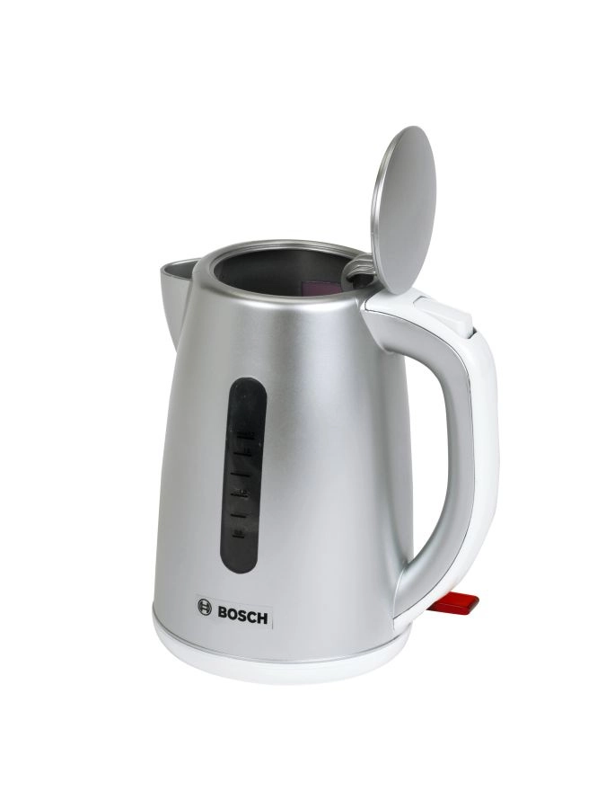 La bouilloire pour enfants au design gris métallisé possède une poignée ergonomique, une fenêtre de niveau et un couvercle facile à ouvrir pour un remplissage aisé pendant le jeu.