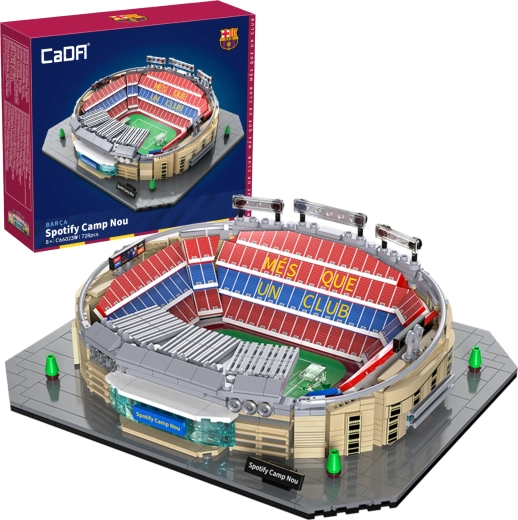 Le modèle détaillé du stade SPOTIFY CAMP NOU de CaDA offre des tribunes colorées authentiques avec l’inscription « Més que un club », des mâts d’éclairage, une façade soignée et une pelouse verte. Avec la licence FC BARCELONA, profitez de détails précis et de pièces de qualité compatibles avec d’autres jeux de construction.