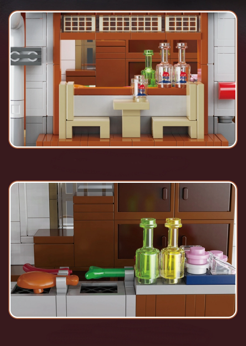 Au rez-de-chaussée, une pièce cosy avec comptoir et grill vous attend, et à l’étage un salon de thé intimiste. Les portes coulissantes et les riches accessoires (nourriture, service à thé) font de ce modèle une superbe pièce d’exposition et un projet ludique pour les constructeurs dès 14 ans. Les lumières LED avec effets renforcent l’ambiance et donnent littéralement vie au modèle le soir.