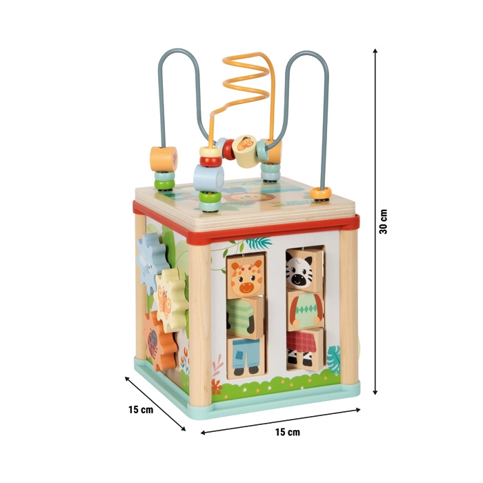 Ce coffret d’activités multifonction en bois certifié FSC offre aux enfants dès 12 mois de riches possibilités de jeu et d’apprentissage. Il propose un labyrinthe de perles, des formes à encastrer, des engrenages, des pistes coulissantes et des cubes rotatifs avec des animaux. Son format compact avec couvercle amovible pouvant être rangé à l’intérieur fait gagner de la place, développe la motricité fine, la coordination œil-main, la perception des formes et des couleurs et stimule la créativité des enfants.