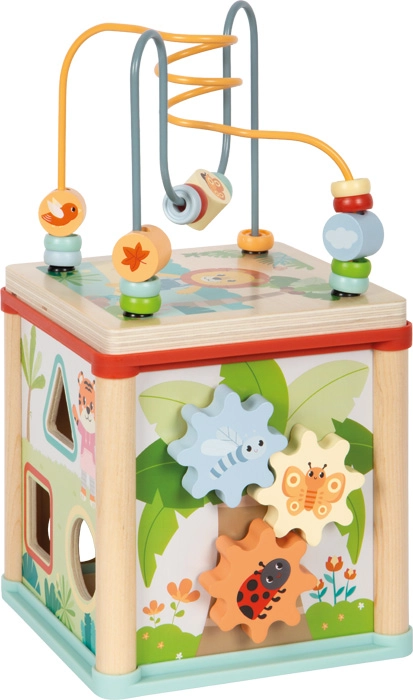 - Plusieurs activités en une – labyrinthe de perles, formes à encastrer, engrenages, pistes coulissantes, cubes rotatifs.