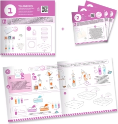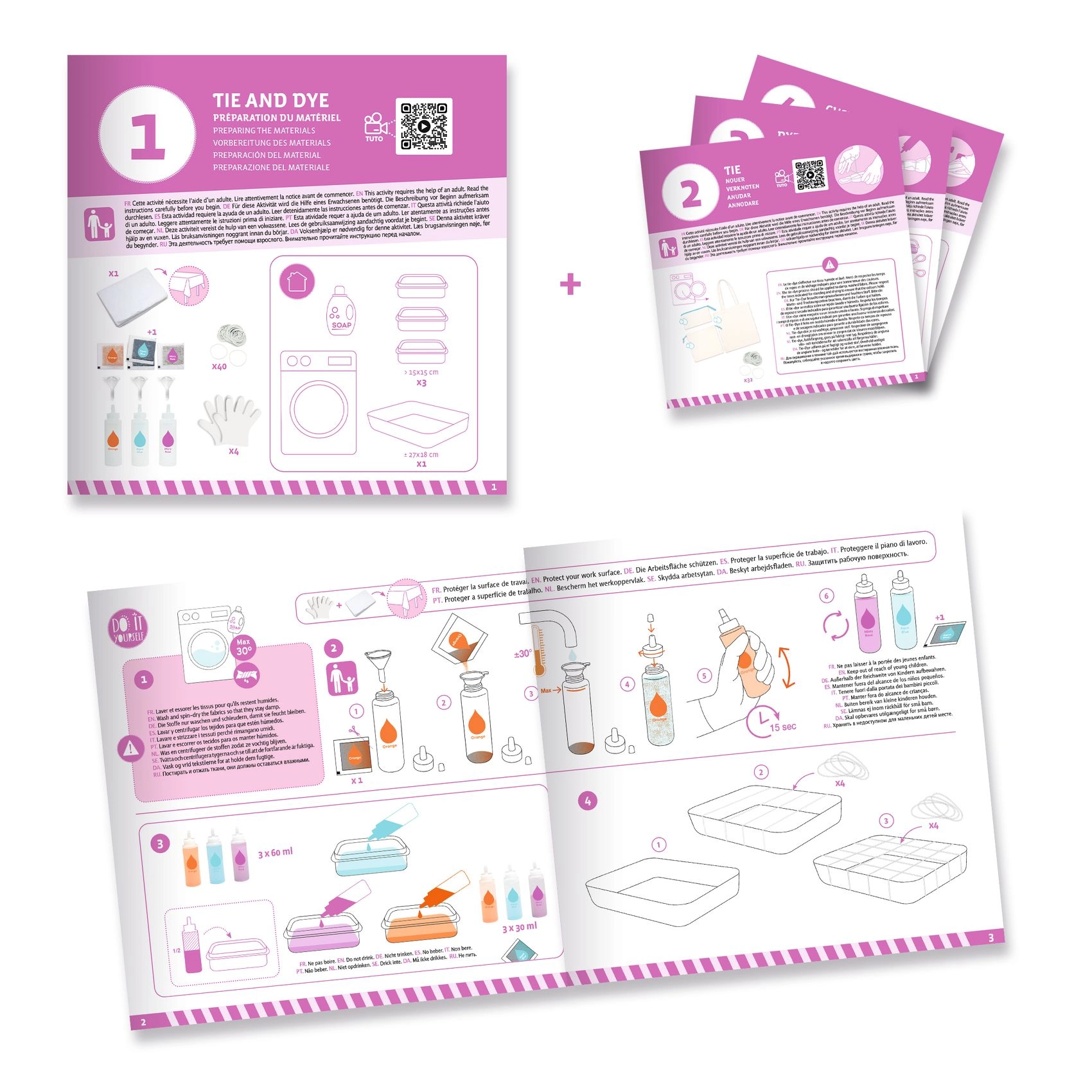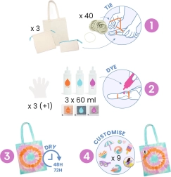 L’emballage contient tout le nécessaire pour bien démarrer : teintures, équipements de protection et manuel. Le résultat : des motifs colorés et durables qui embellissent sacs, pochettes et trousses. Une excellente idée pour un après-midi créatif à la maison ou un cadeau pour de jeunes designers.