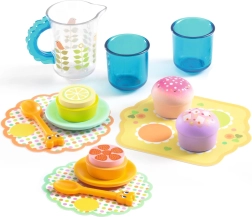 Tasses, théière, assiettes et cuillères aux couleurs vives invitent au jeu d’imitation, au service et au versement des gourmandises.