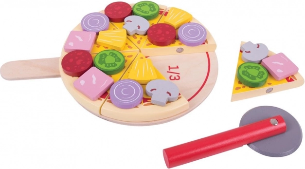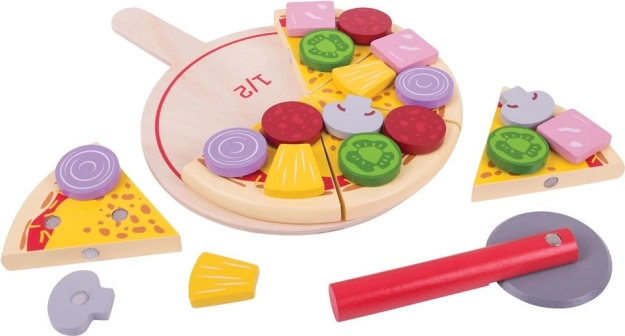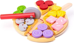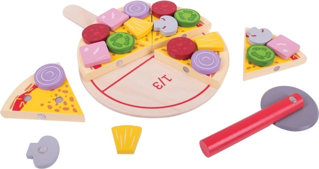 La pizza en bois à découper est un jouet idéal pour le jeu de rôle créatif. Les enfants peuvent « cuire », découper et servir la pizza, la garnir de champignons, d’oignons, de poivron ou de salami, tout en entraînant la coordination œil-main. La planche avec marquages de fractions aide à expliquer de façon ludique des notions comme 1/2, 1/3 ou 1/6.