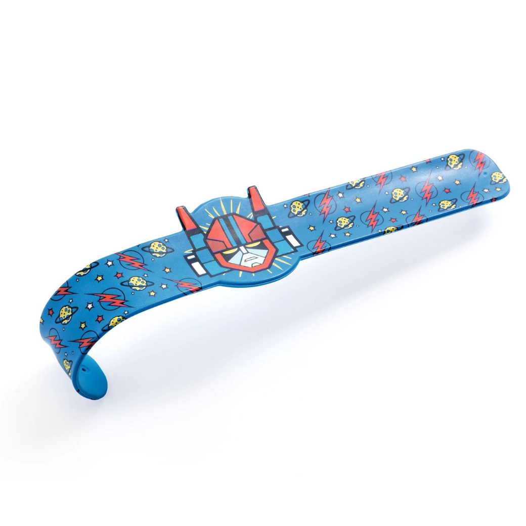 Découvrez les bracelets slap DJECO avec des motifs de super-héros, dinosaures, tigres et robots. Grâce à la bande métallique flexible recouverte d’un plastique résistant, le bracelet s’enroule tout seul autour du poignet d’un léger « clac ». Les enfants l’adorent pour sa mise en place sûre et rapide et son design affirmé.