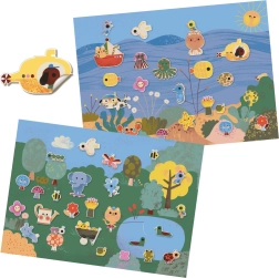 Ce kit créatif propose deux arrière-plans illustrés – le monde sous-marin et la forêt avec étang – et une planche de stickers adorables avec des poissons, un crabe, un sous-marin, un bateau, des animaux de la forêt et bien d’autres motifs. Les enfants peuvent déplacer les autocollants à volonté et inventer sans cesse de nouvelles histoires.