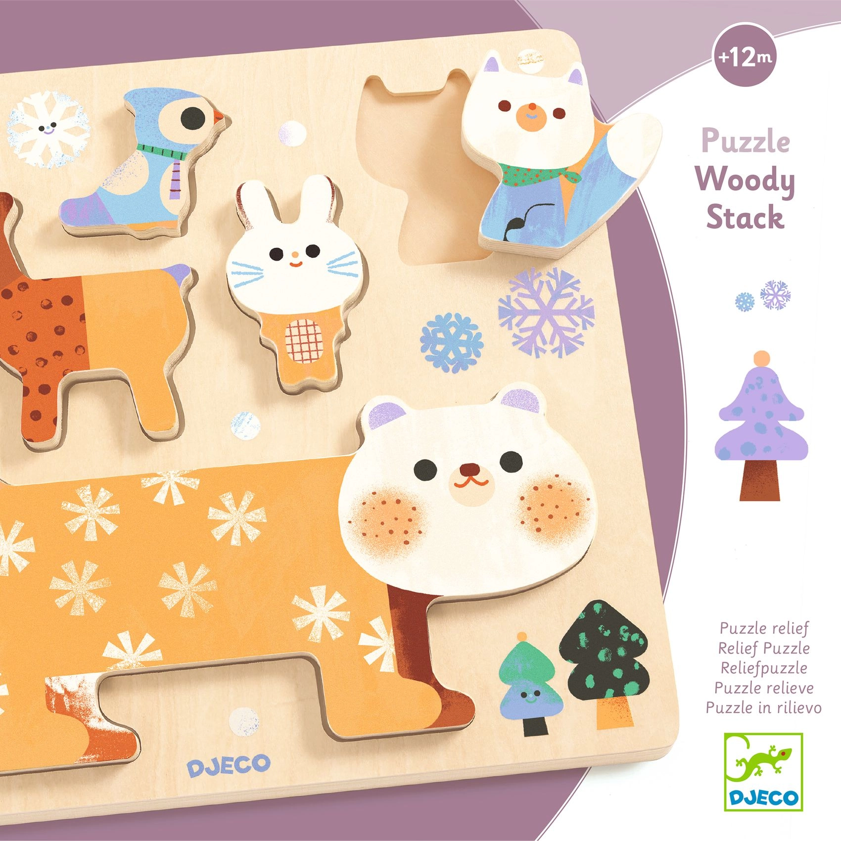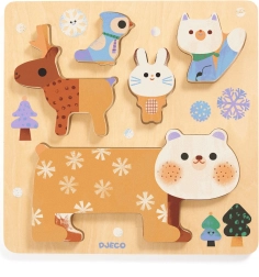 Ce coffret combine un puzzle en bois à encastrer classique et une tour d’équilibre. Les animaux amusants – ours, lapin, oiseau, biche et chouette – peuvent être insérés dans le plateau selon leur forme ou empilés pour tester l’équilibre. Le jeu aide les enfants à développer la patience et la perception spatiale.