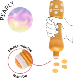 Les feutres mousse DJECO à fini nacré sont conçus pour les petits artistes. Grâce à leur large pointe en mousse, la couleur s’applique uniformément, ne coule pas et se lave facilement de la peau comme de la plupart des textiles. Le délicat effet nacré apporte une touche magique à chaque dessin.