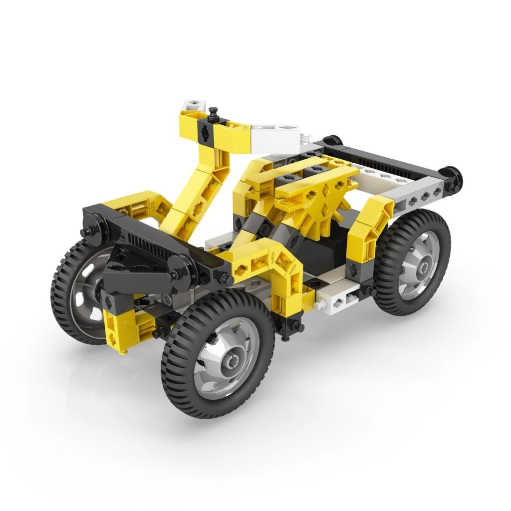 Ce kit universel apporte à la fois divertissement et apprentissage. À partir d’un seul set de pièces, construisez des voitures, hélicoptères, grues, machines et mécanismes mécaniques. Le moteur alimenté par 2× piles AAA (non incluses) donne du mouvement aux modèles et initie les enfants aux bases de la mécanique.
