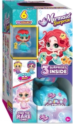 Chaque boîte en forme de coquillage renferme 3 surprises qui enrichissent l’univers des sirènes et encouragent la passion de collectionner. Les combinaisons de couleurs des cheveux, des couronnes et des queues sont réfléchies et harmonieuses – par exemple une sirène aux cheveux bleus avec une queue rose, ou une sirène aux cheveux jaunes avec une queue violette et une couronne aux motifs marins.
