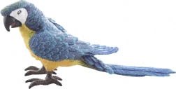 Le plumage texturé, la forme du bec et des griffes, ainsi que la longue queue caractéristique, donnent l’impression d’un véritable ara bleu et jaune.