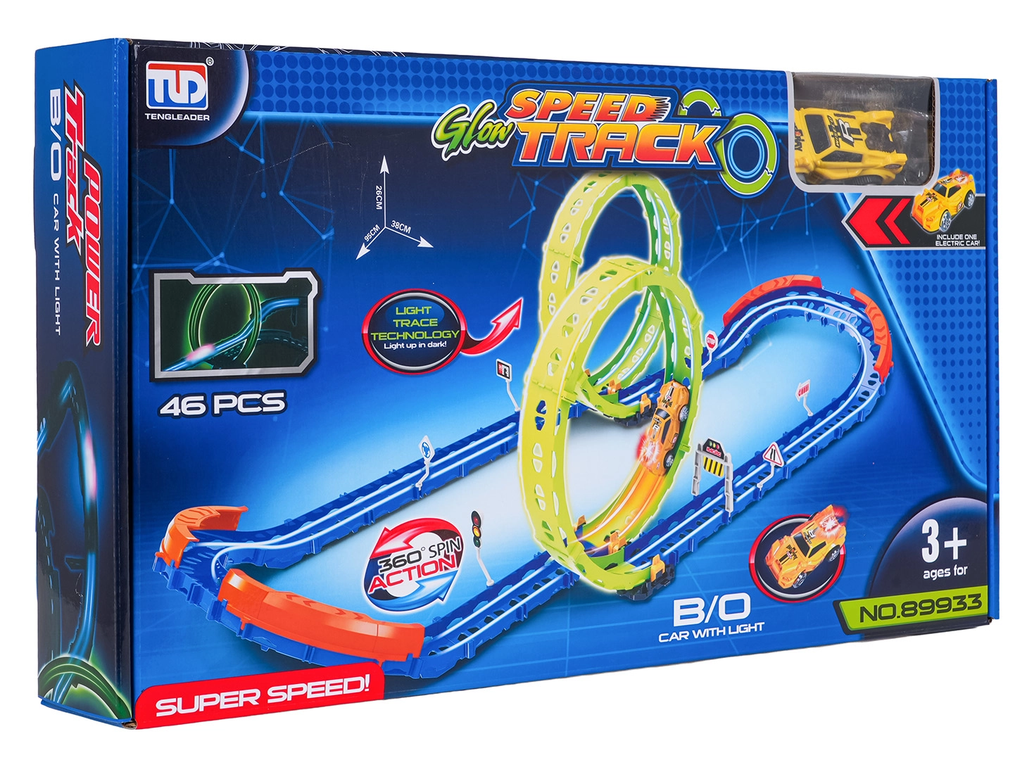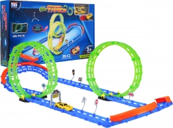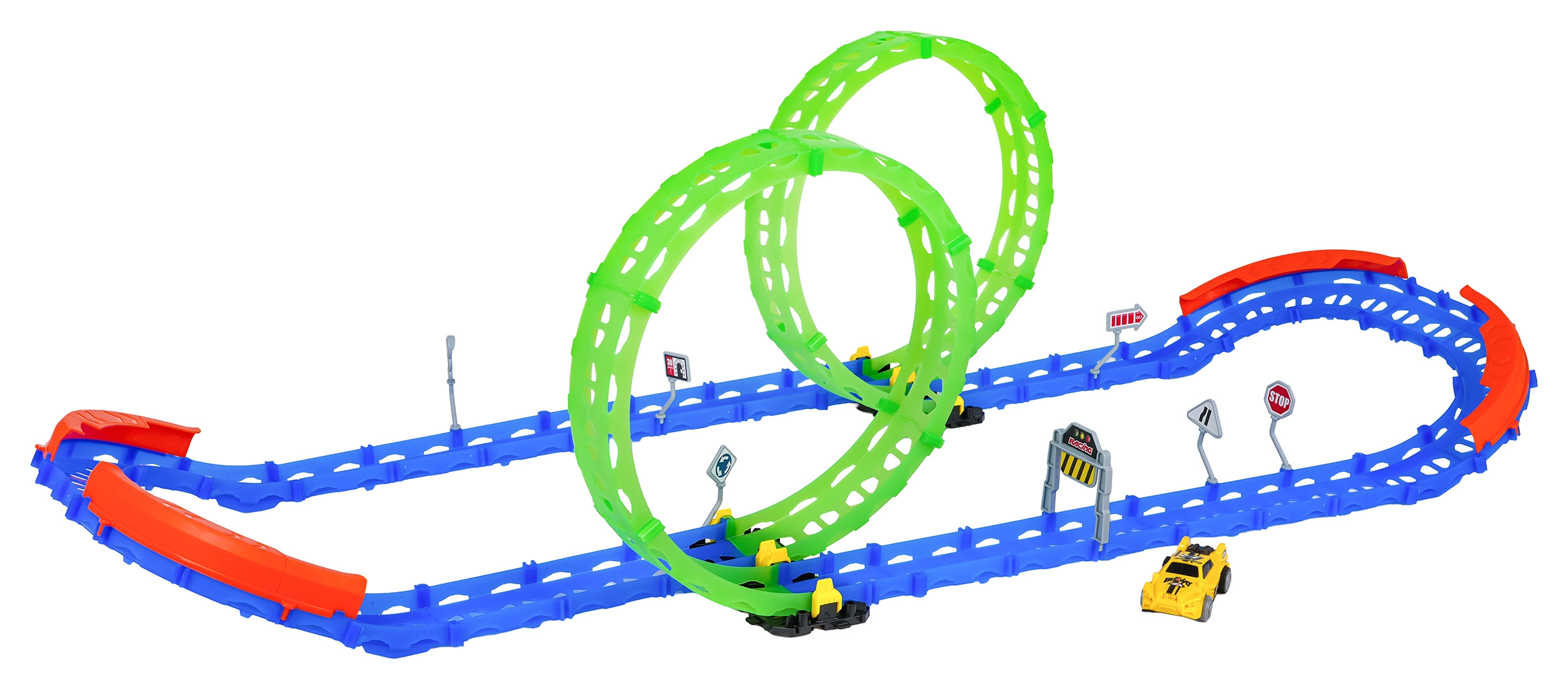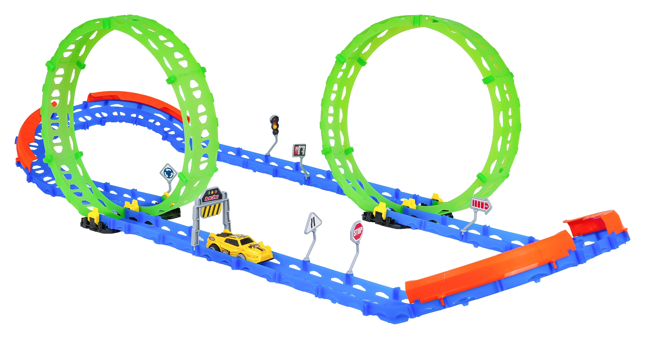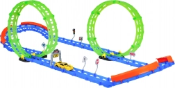 Cette piste de course fluorescente est idéale pour les enfants dès 3 ans. Grâce à deux grands loopings et à des barrières latérales robustes, la voiture franchit en toute sécurité même les courbes serrées. Des éléments photoluminescents illuminent la course dans la pénombre et transforment la chambre en mini-circuit.