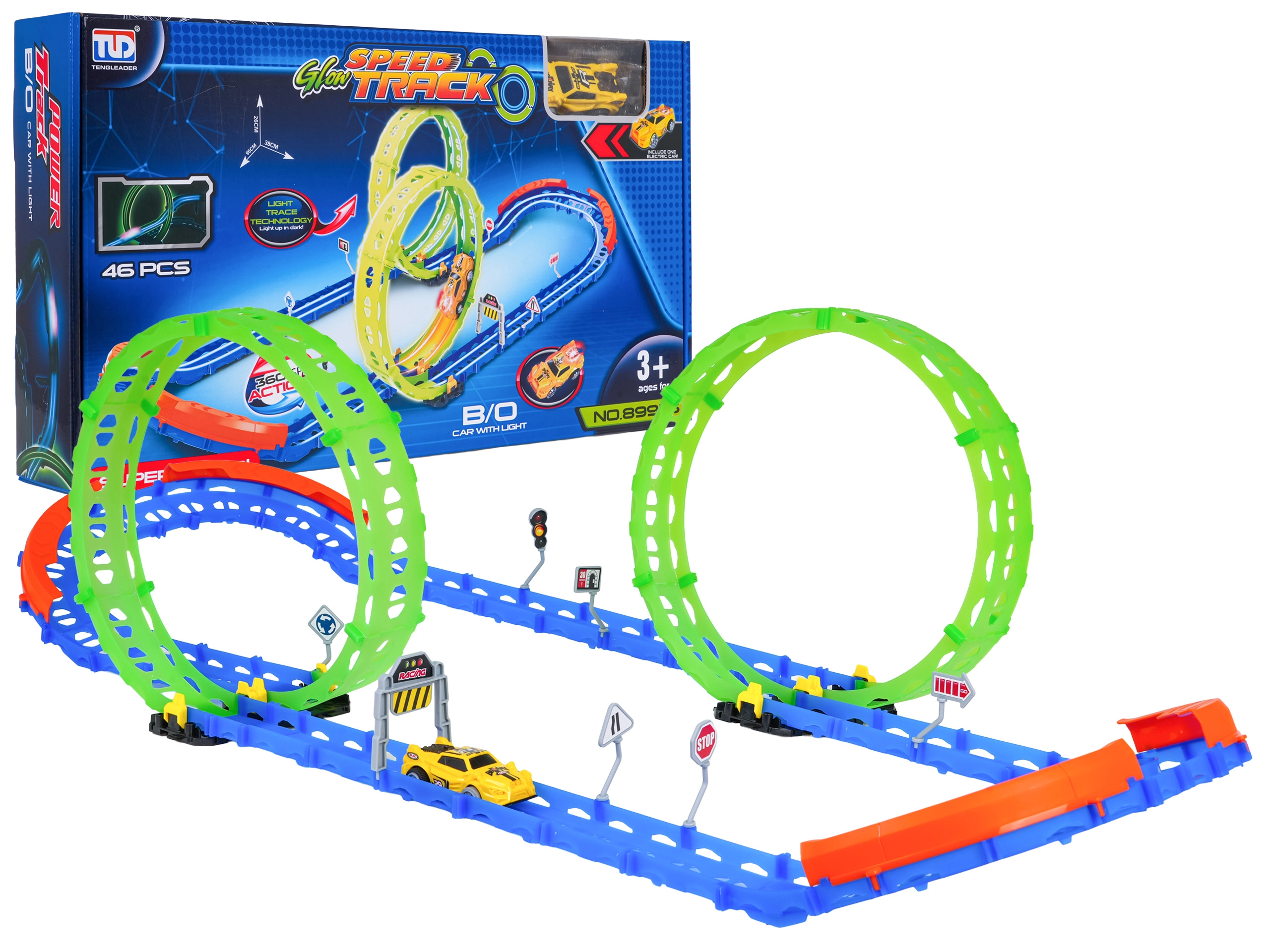 • Loopings lumineux – les éléments fluorescents brillent dans le noir et renforcent l’effet de course.