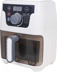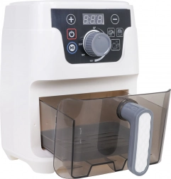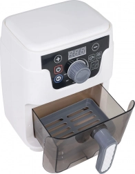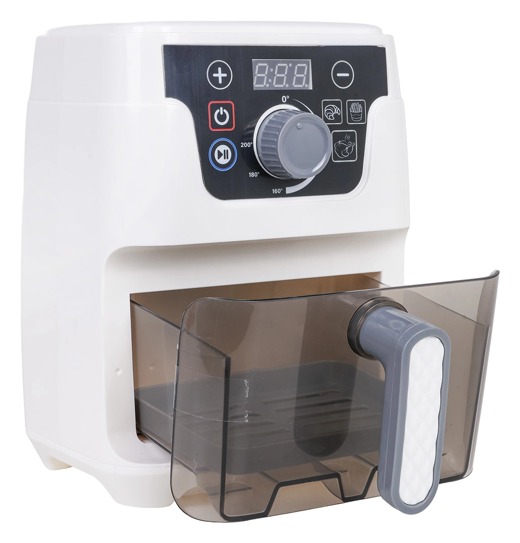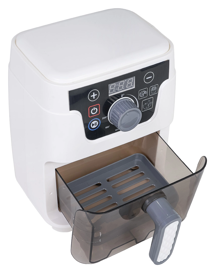 Cette friteuse à air pour enfants, finement réalisée, ressemble et fonctionne comme un véritable appareil : panier rétroéclairé, affichage numérique et sons pour la cuisson au four, la friture ainsi que l’ouverture/fermeture du tiroir. Les programmes automatiques affichent le temps sur l’écran (petit pain 2:50, frites 2:00, poulet 3:00) et, une fois le cycle terminé, l’appareil s’éteint automatiquement avec une alerte sonore.