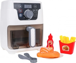 Friteuse à air interactive pour enfants offrant un jeu de cuisine réaliste dès 3 ans. Elle propose des effets lumineux, des sons de cuisson et de friture, un panier ouvrant et un minuteur facile à régler. Inclus, de nombreux accessoires pour jouer à cuisiner : frites, nuggets de poulet, petit pain, petite assiette, pince et ketchup.