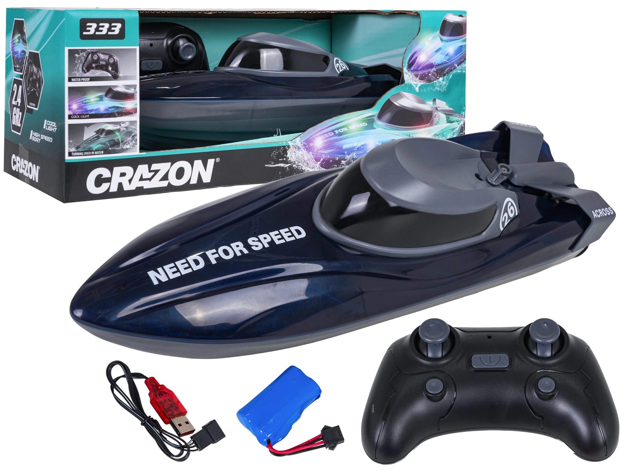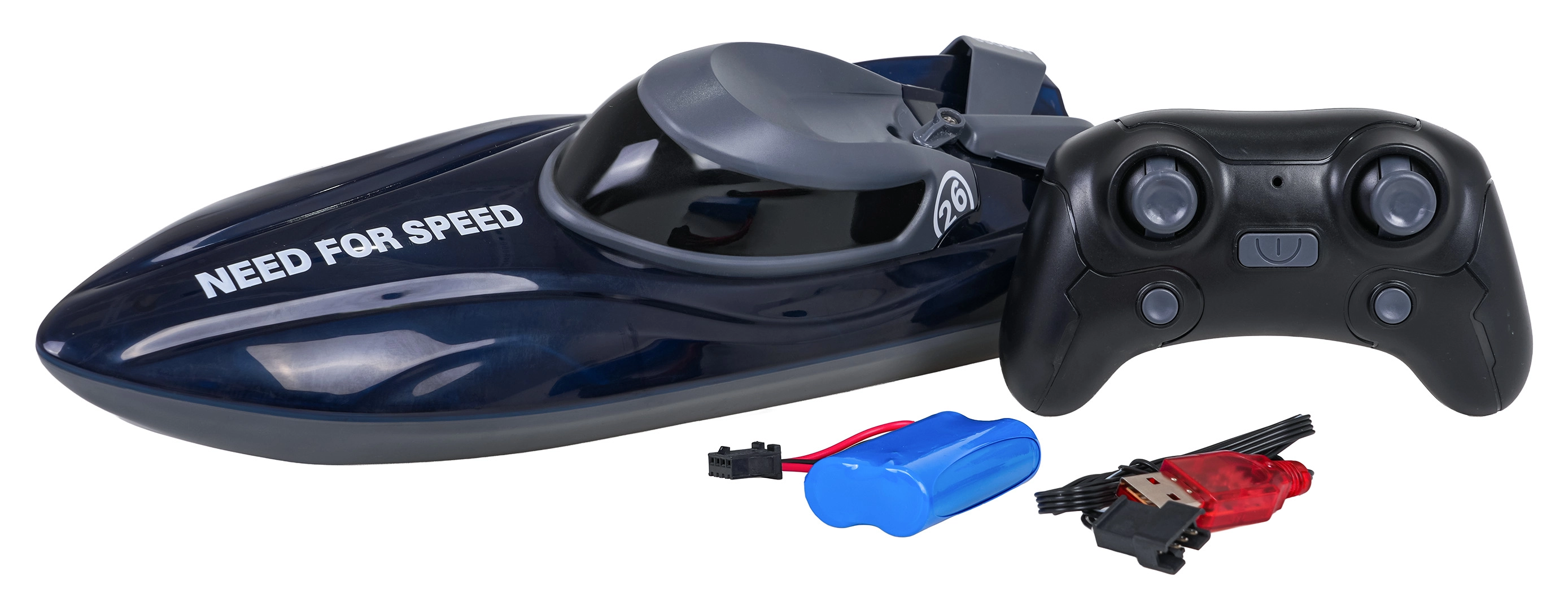 La coque éclairée améliore la visibilité et donne un look attrayant au crépuscule. Portée de commande env. 30 m, autonomie jusqu’à 20 minutes avec une batterie 7,4 V et recharge USB (env. 3 heures) en font un jouet idéal pour la piscine comme pour une surface d’eau calme.