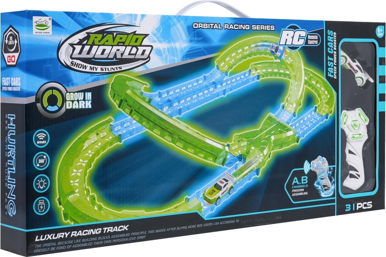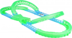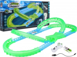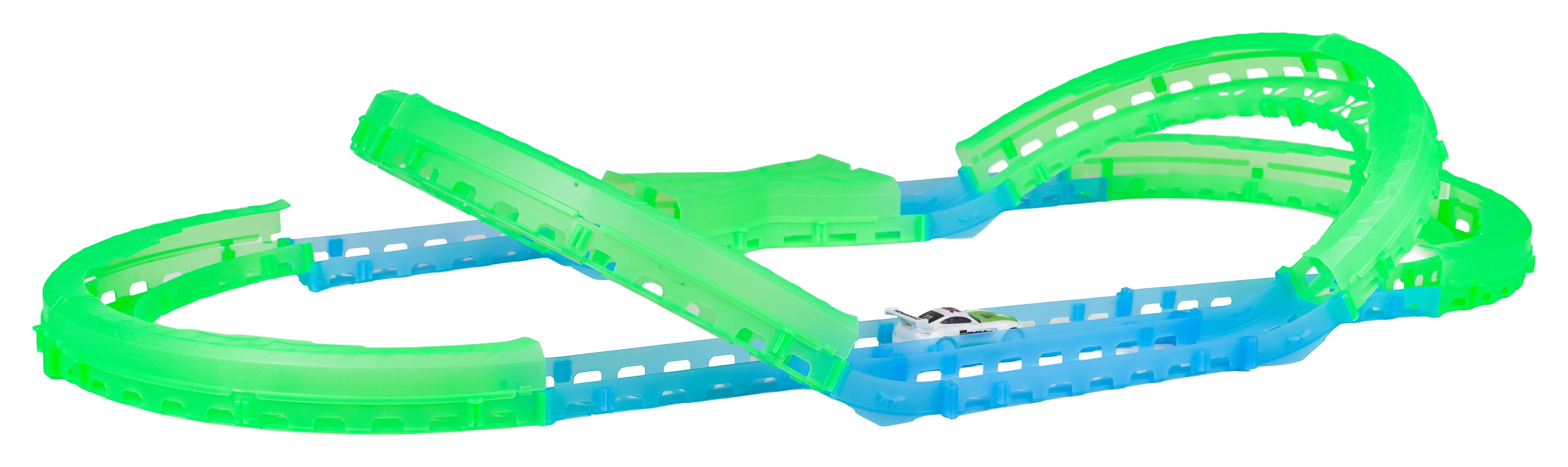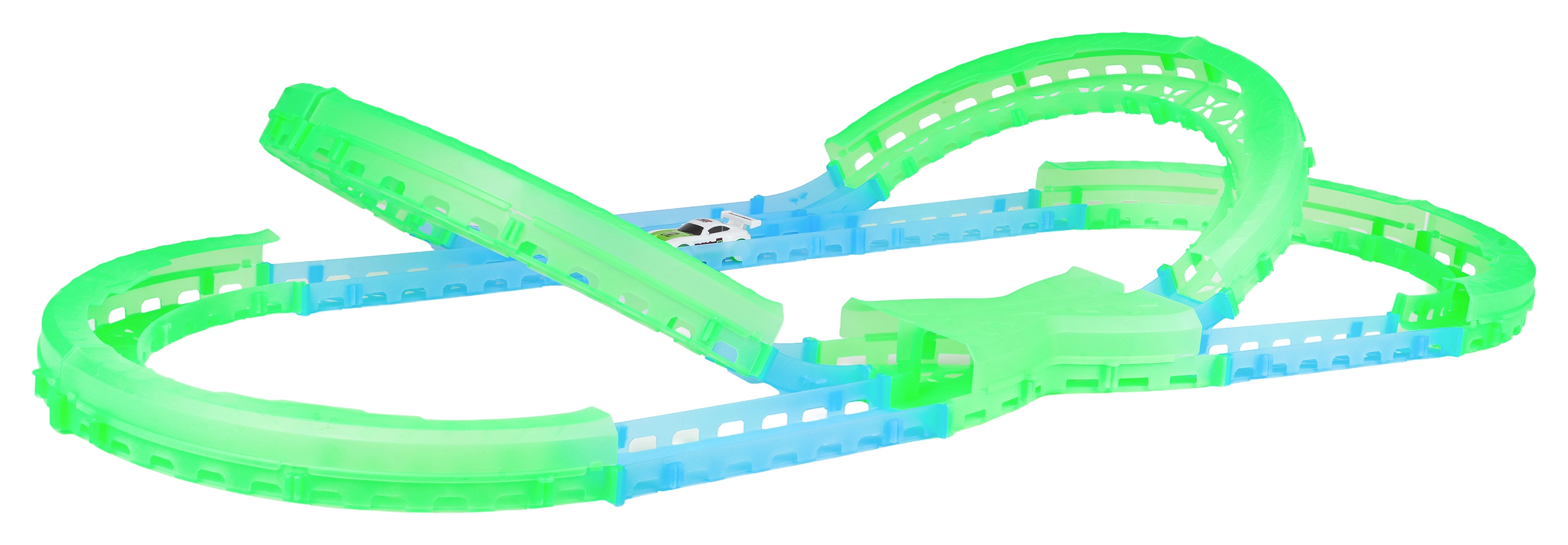 Les éléments fluorescents de la piste et l’éclairage LED de la voiture transforment chaque course en un show lumineux qui ne lassera pas les enfants.
