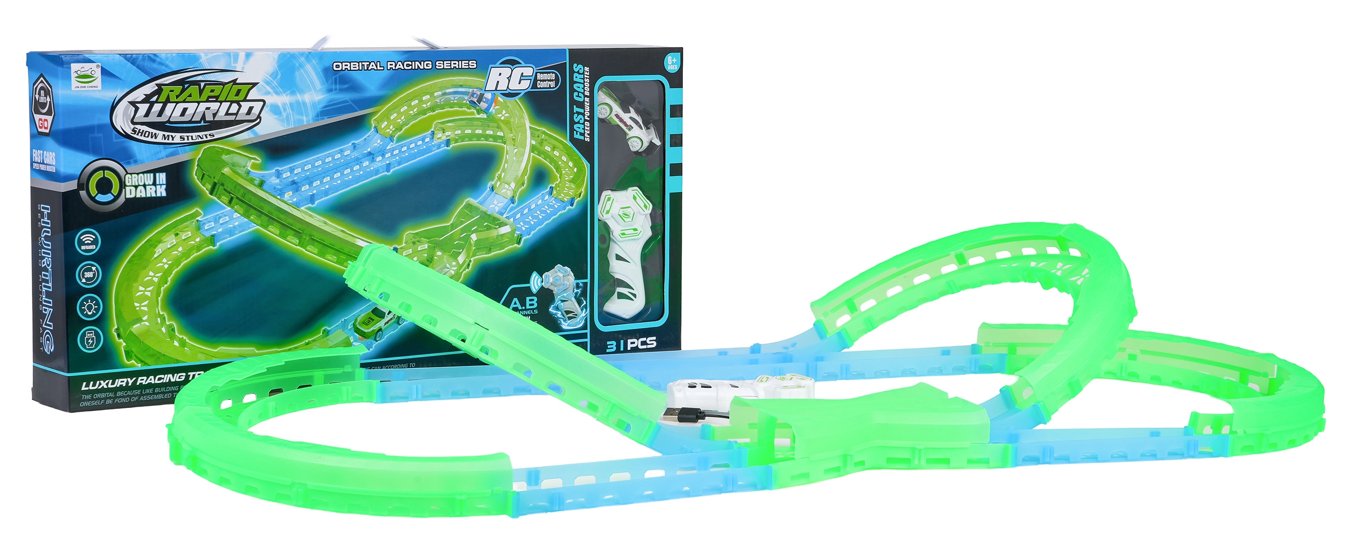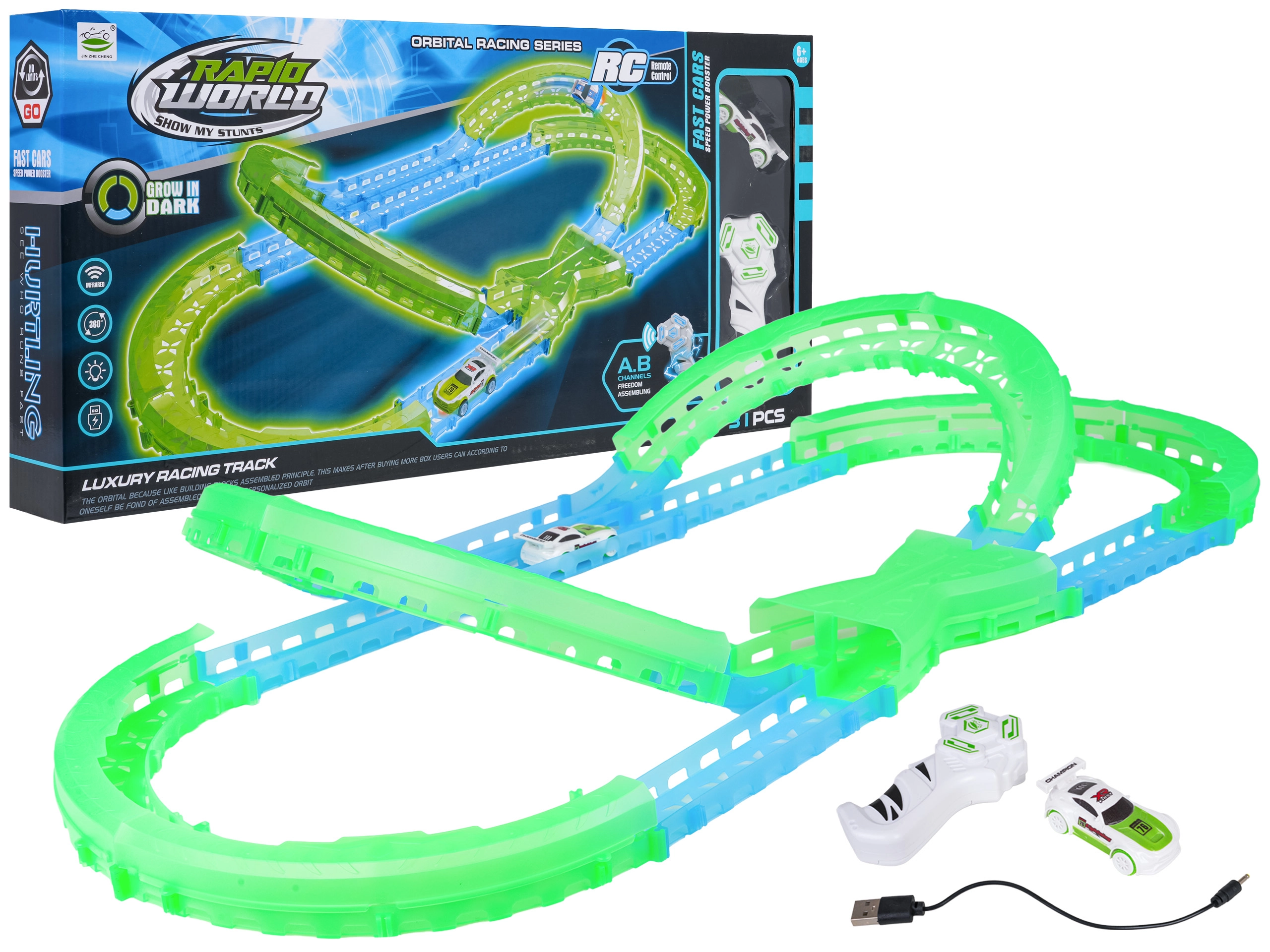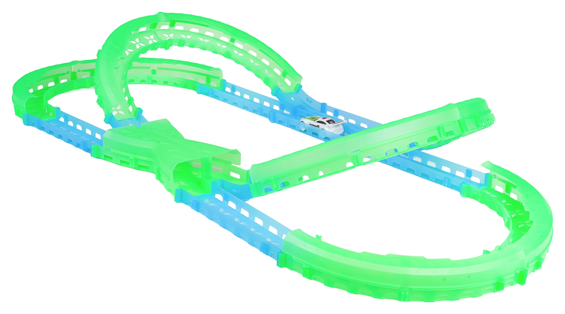 Les éléments fluorescents de la piste et l’éclairage LED de la voiture transforment chaque course en un show lumineux qui ne lassera pas les enfants.