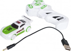 Une mini voiture de course compacte avec éclairage LED se pilote avec la télécommande fournie. La recharge est assurée par le câble USB inclus.