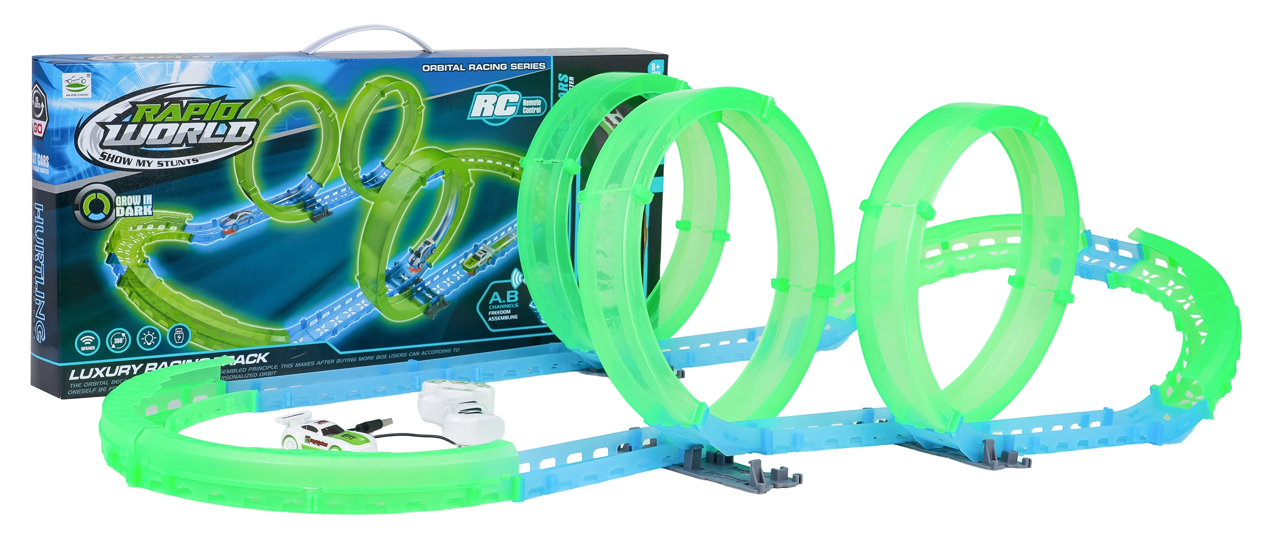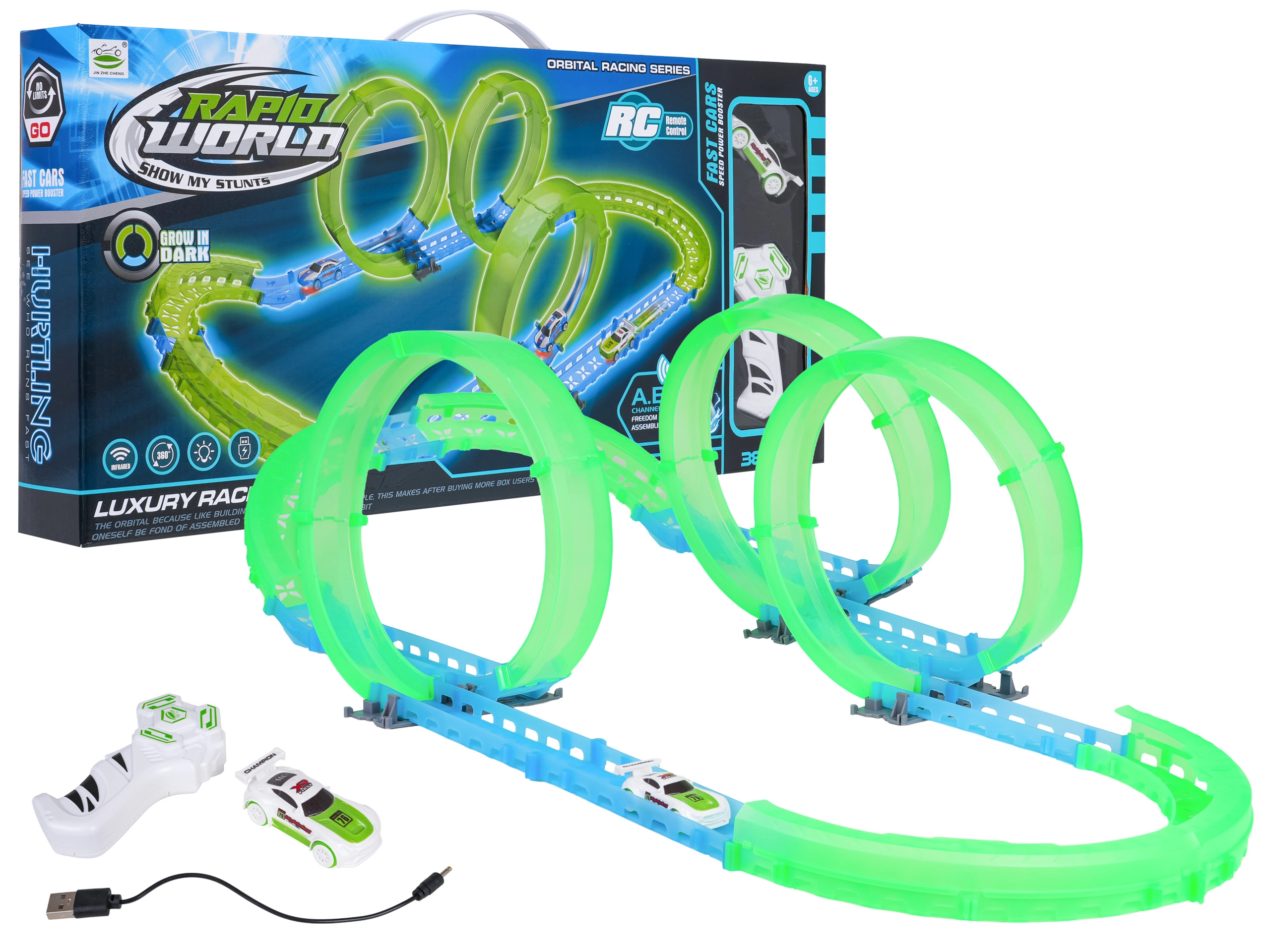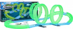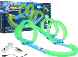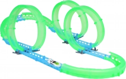 Piste de course lumineuse pour enfants dès 6 ans offrant des sensations avec une mini voiture RC à éclairage LED. La piste fluorescente brille dans l’obscurité, la voiture se recharge via USB et la télécommande fonctionne avec 2× AAA (non incluses). Montage simple, super effets lumineux et divertissement qui développe la coordination et l’imagination.
