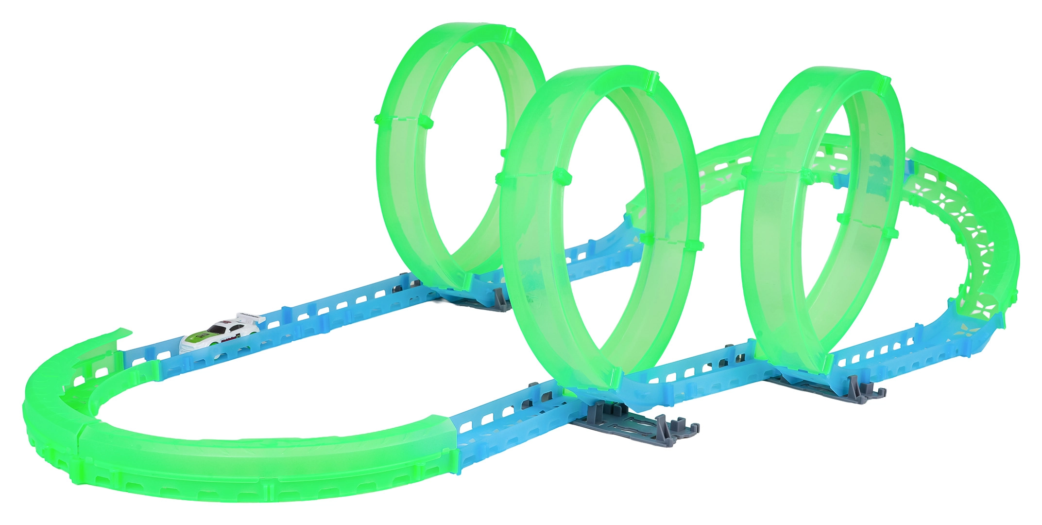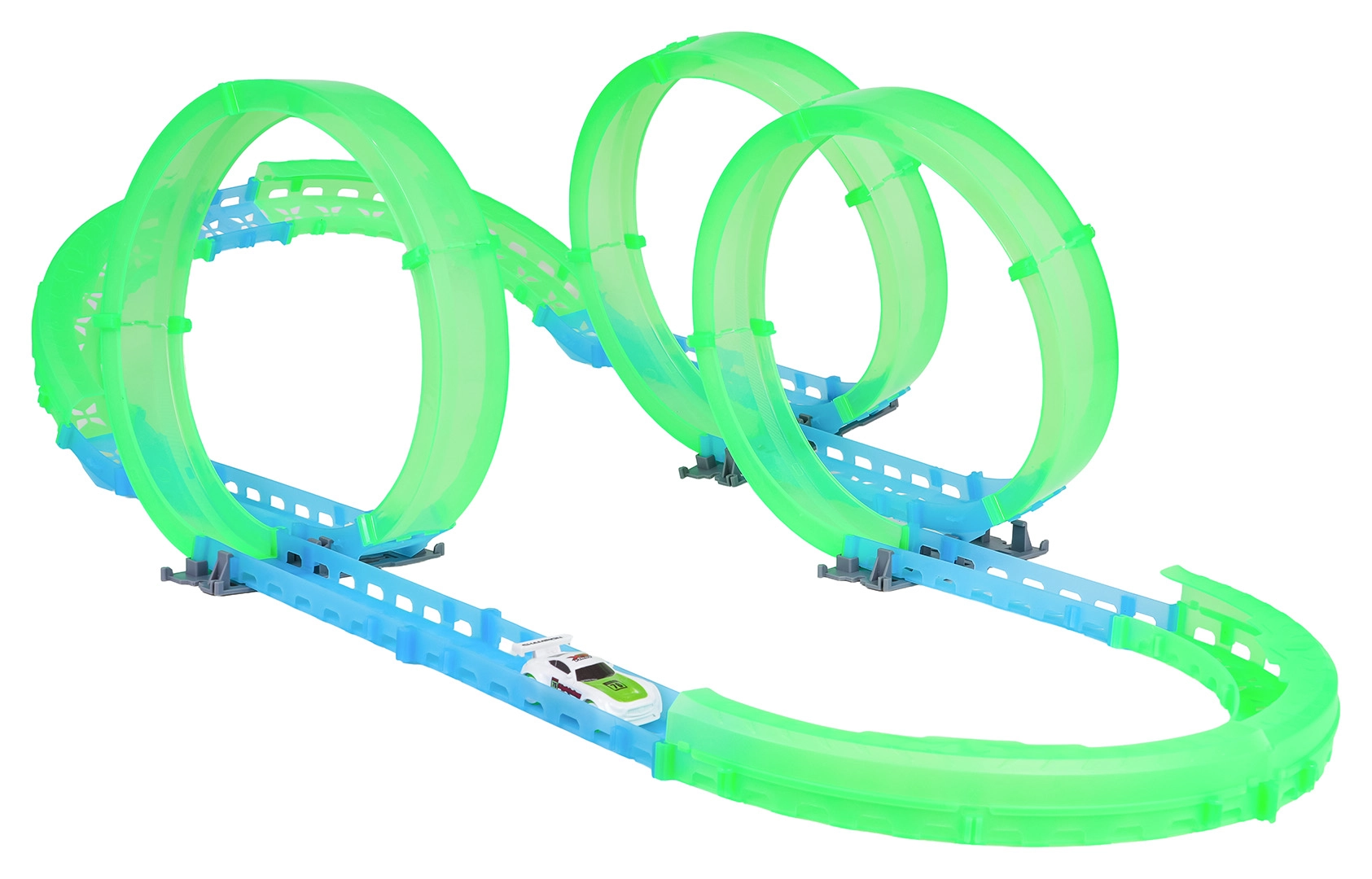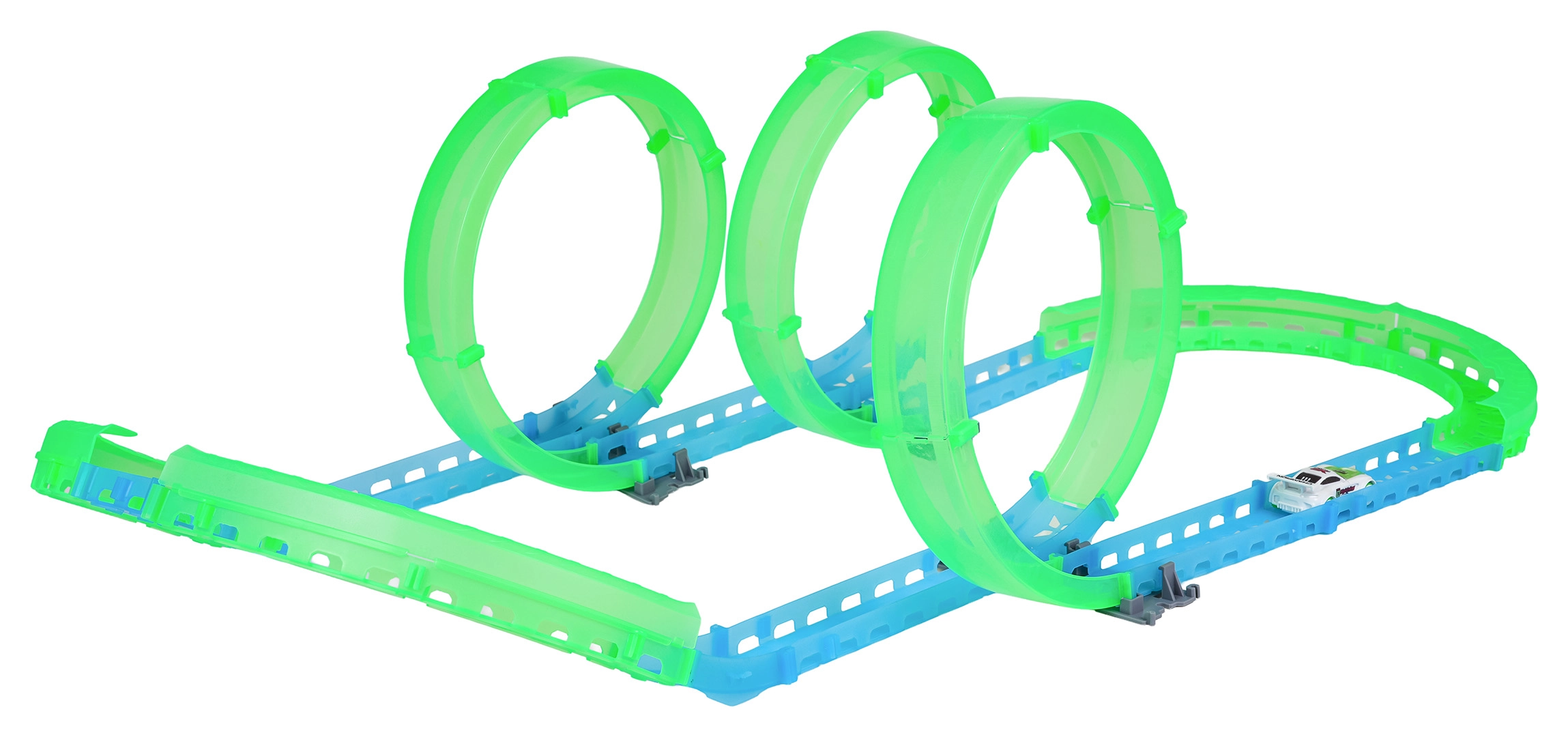 Construisez votre propre piste de cascades et profitez de la course même après la tombée de la nuit. Les éléments fluorescents brillent dans l’obscurité et la petite voiture RC avance sur le circuit préparé. Grâce à l’éclairage LED, elle crée de superbes traînées lumineuses en roulant.