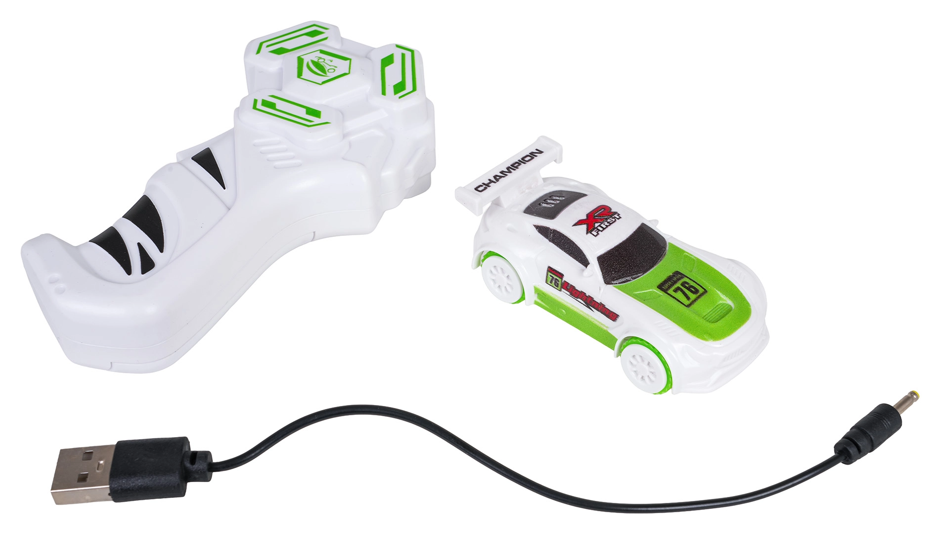 Éléments de piste, voiture RC, télécommande, câble de recharge USB, manuel d’assemblage