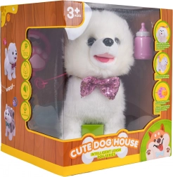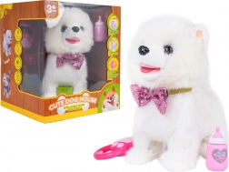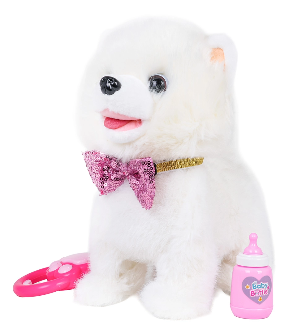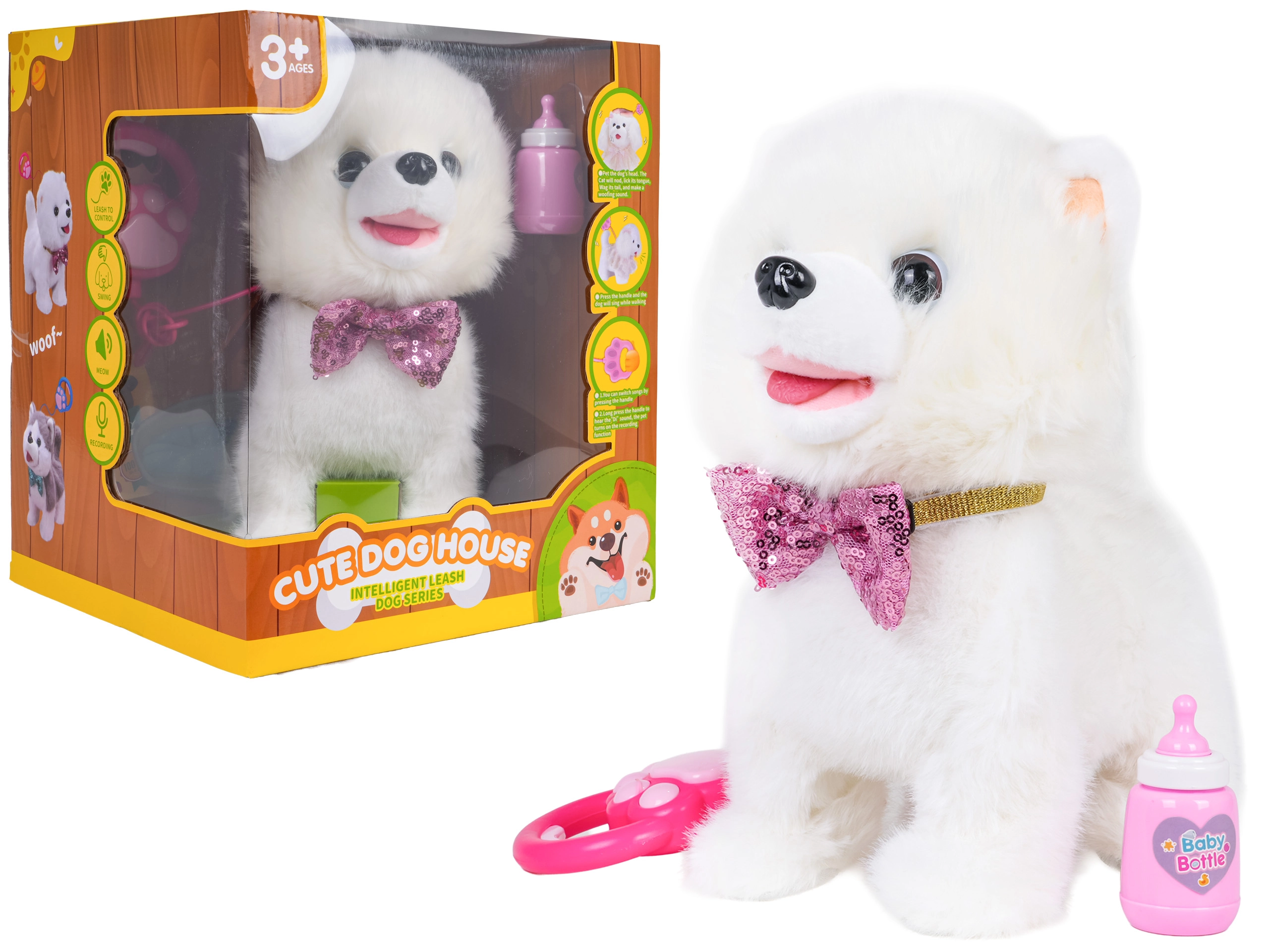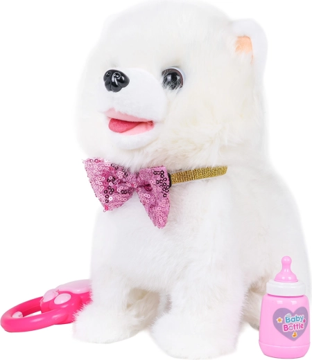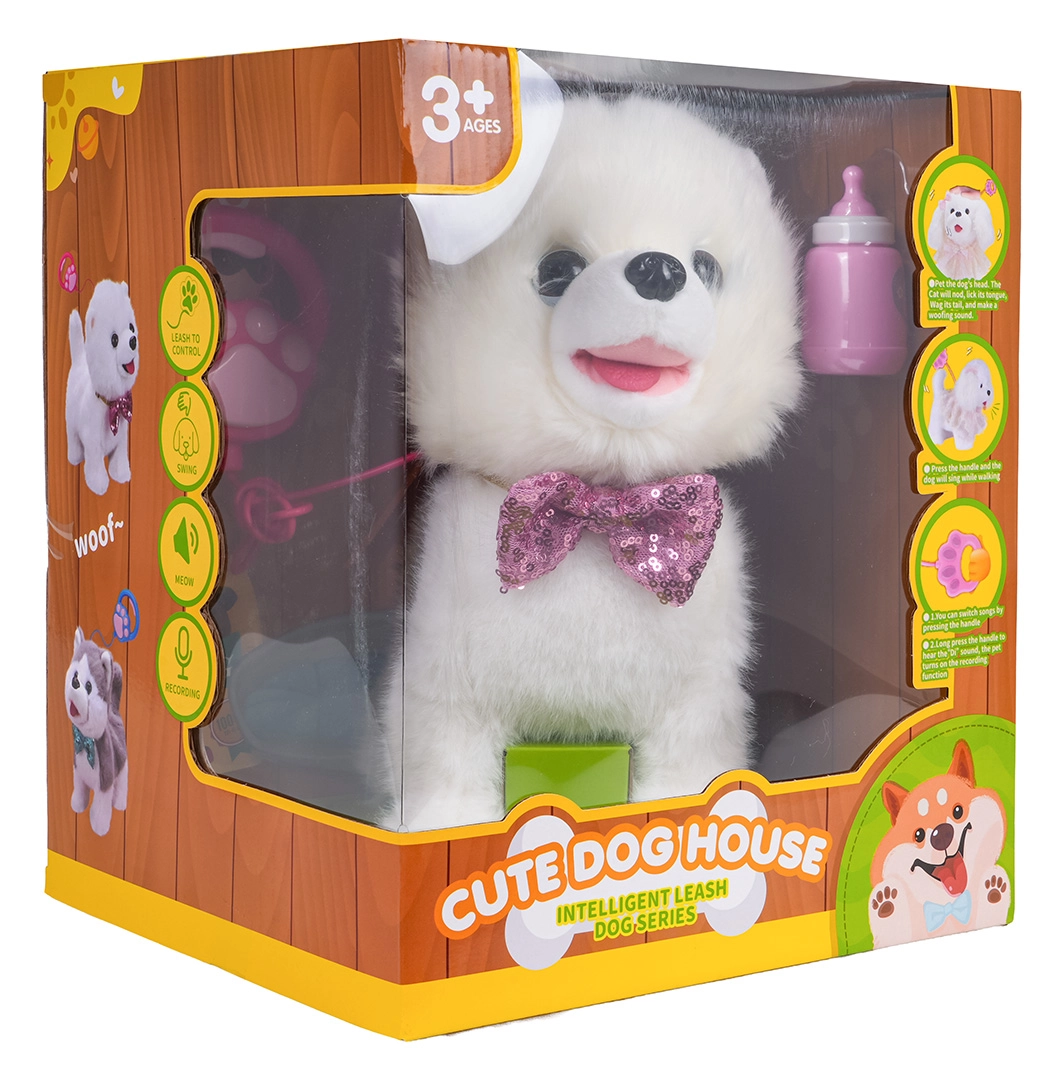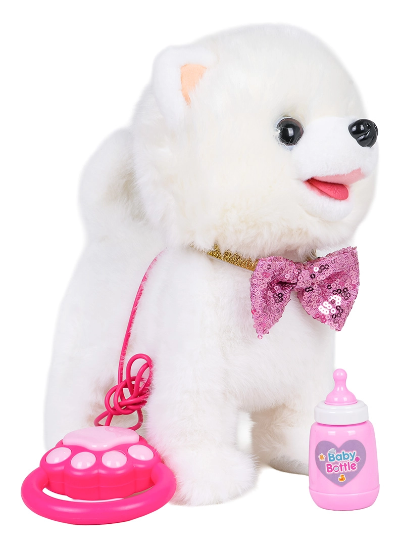 Adorable chiot interactif blanc pour enfants dès 3 ans, offrant beaucoup de jeux et de câlins. Il est fabriqué avec des matériaux doux et sûrs, sait marcher, aboyer, remuer la queue, hocher la tête et même lécher avec sa petite langue. Grâce à la télécommande/laisse, il réagit à la pression, marche en rythme avec la musique et dispose d’une fonction d’enregistrement et de lecture, il répétera donc vos mots de manière adorable. Un biberon pour le nourrir est également inclus pour un jeu encore plus réaliste.