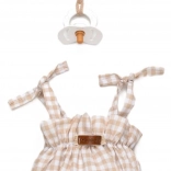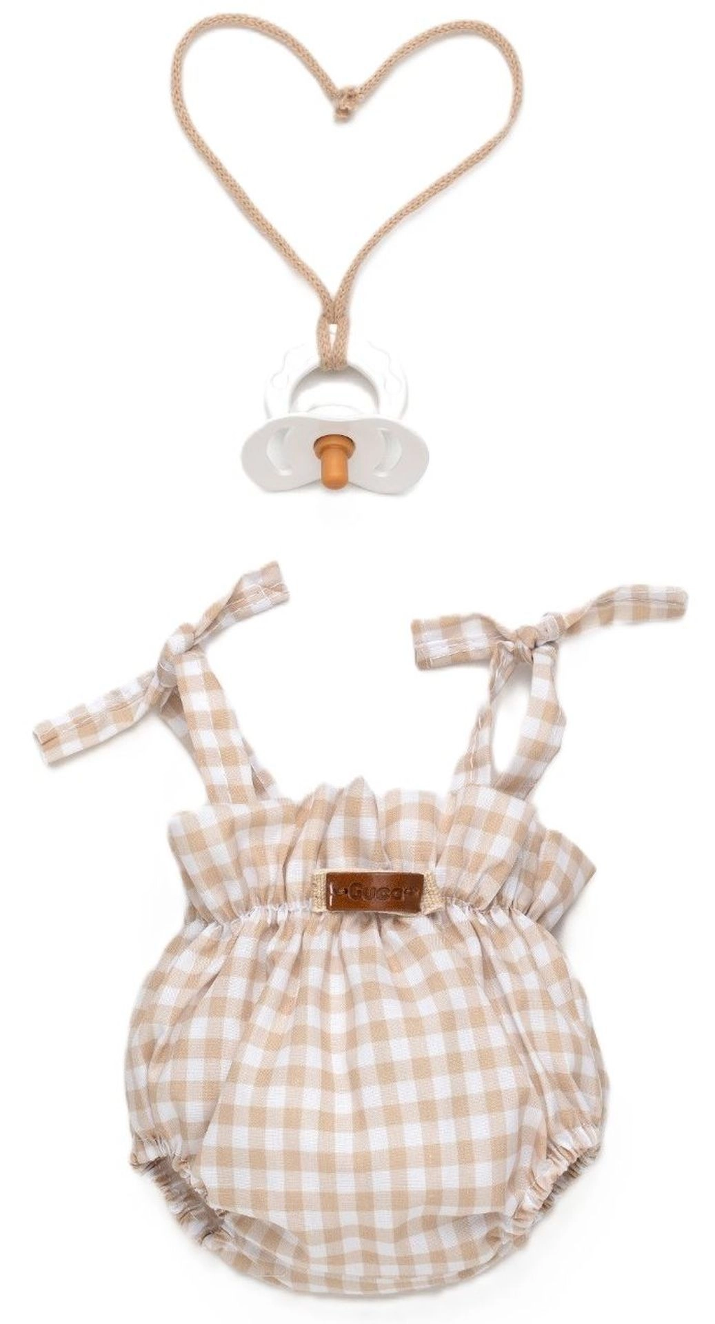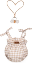 Romper à carreaux beige et blanc avec bretelles à nouer, bas élastiqués et taille froncée, s’ajuste en toute sécurité à la poupée et rend superbement en photo.