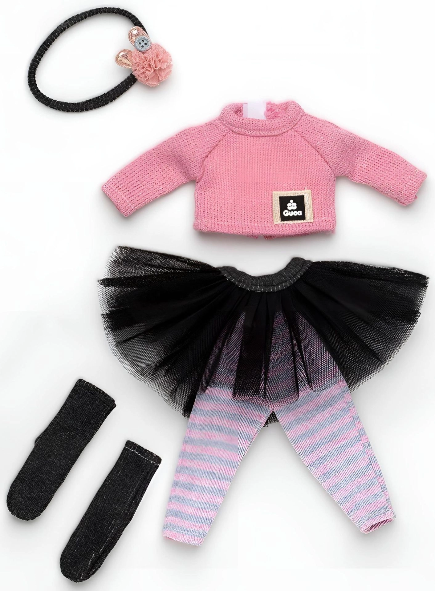 L’emballage contient quatre pièces de vêtements et un serre-tête décoratif assorti, grâce auxquels vous créerez facilement différentes tenues pour chaque occasion. Le set est emballé de manière pratique dans une pochette plastique sur un support en carton, afin que tout soit bien organisé et prêt à offrir.