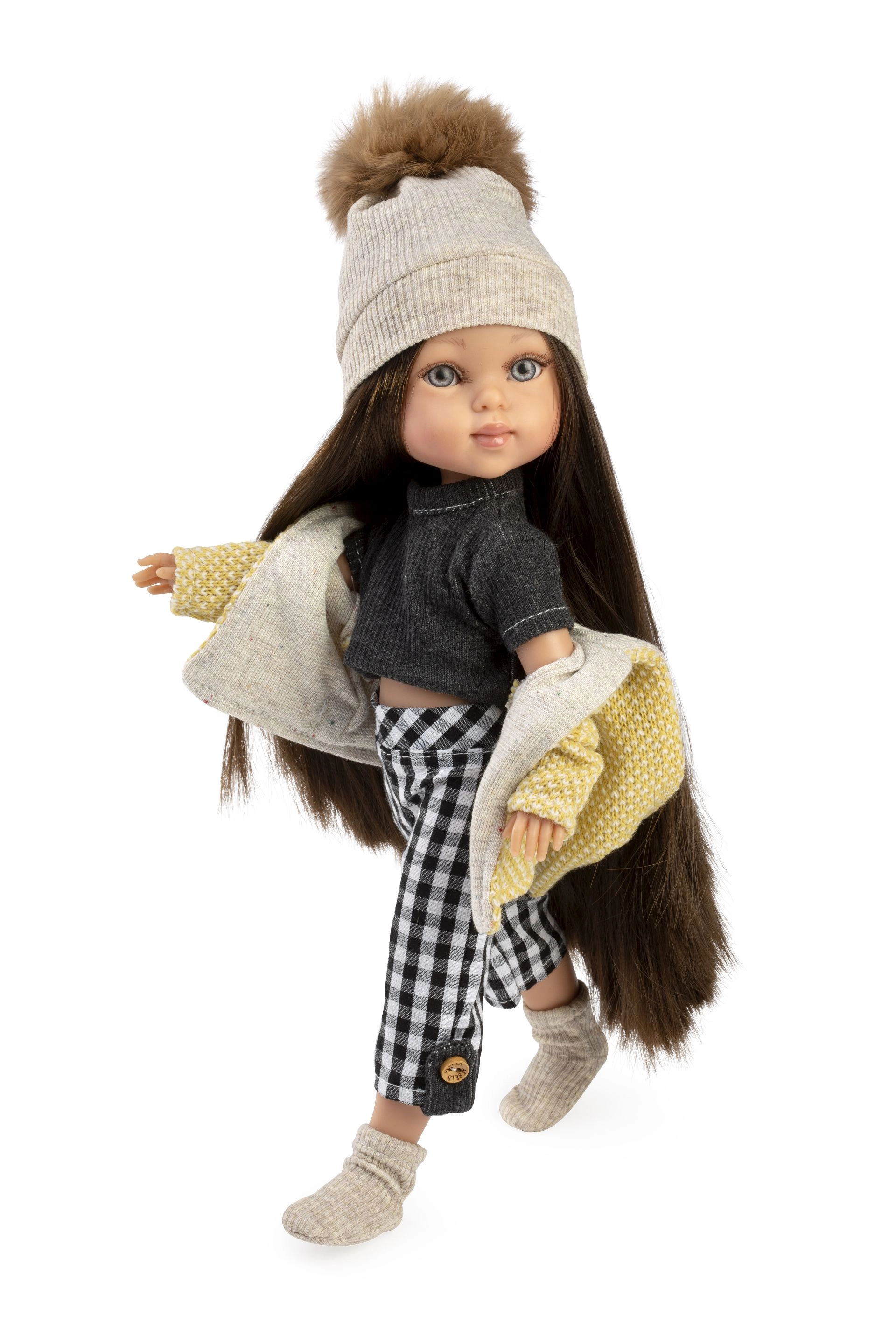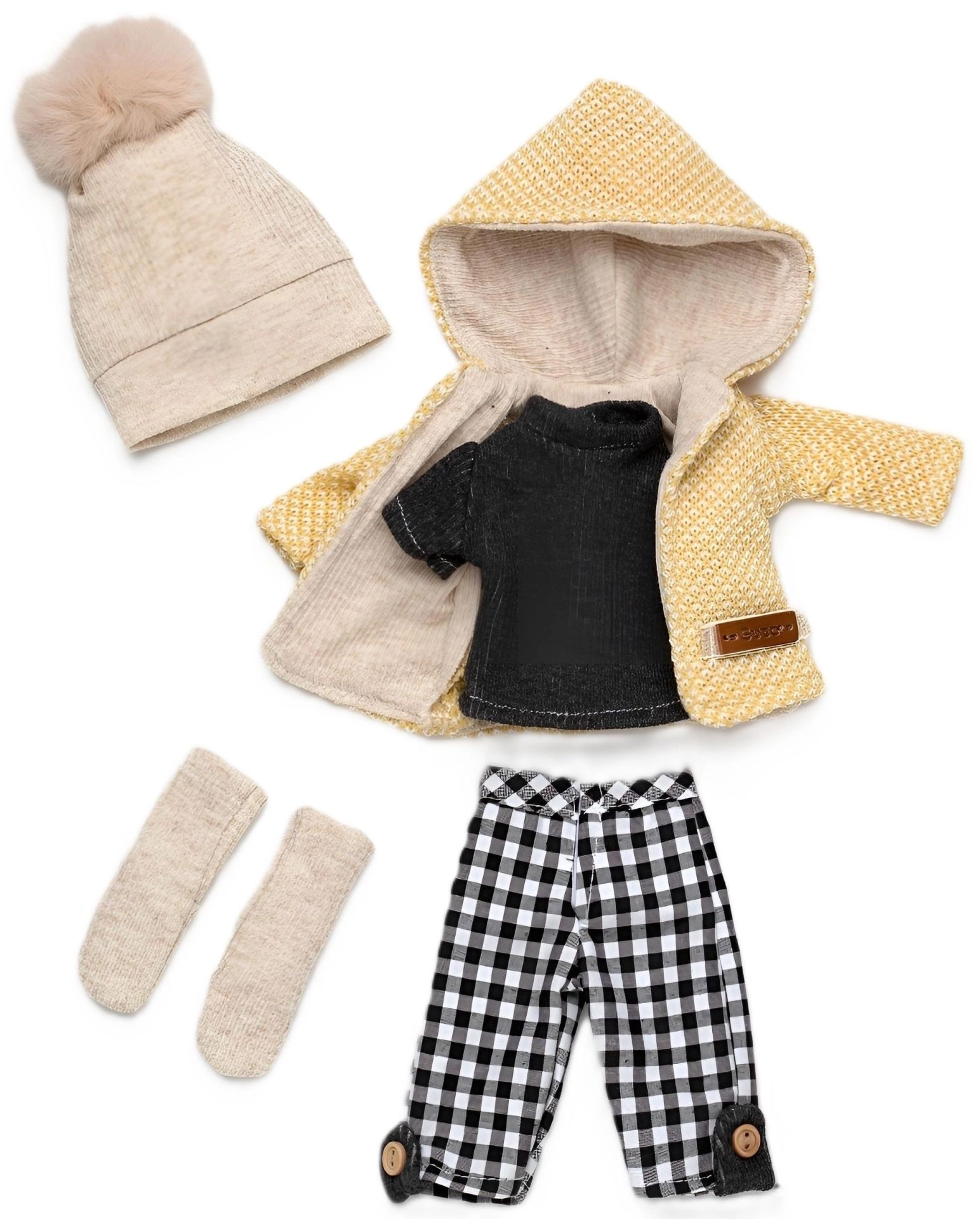 Enrichissez la garde-robe de votre poupée Penelope avec une collection coordonnée de 5 pièces qui combine un motif à carreaux moderne avec des tricots chaleureux. Le set comprend une veste à capuche jaune avec une douce doublure, un bonnet tricoté à pompon, un t-shirt noir, un pantalon à carreaux avec détails boutons et des chaussettes/jambières tricotées. Le tout est conçu pour être facile à enfiler et à retirer.