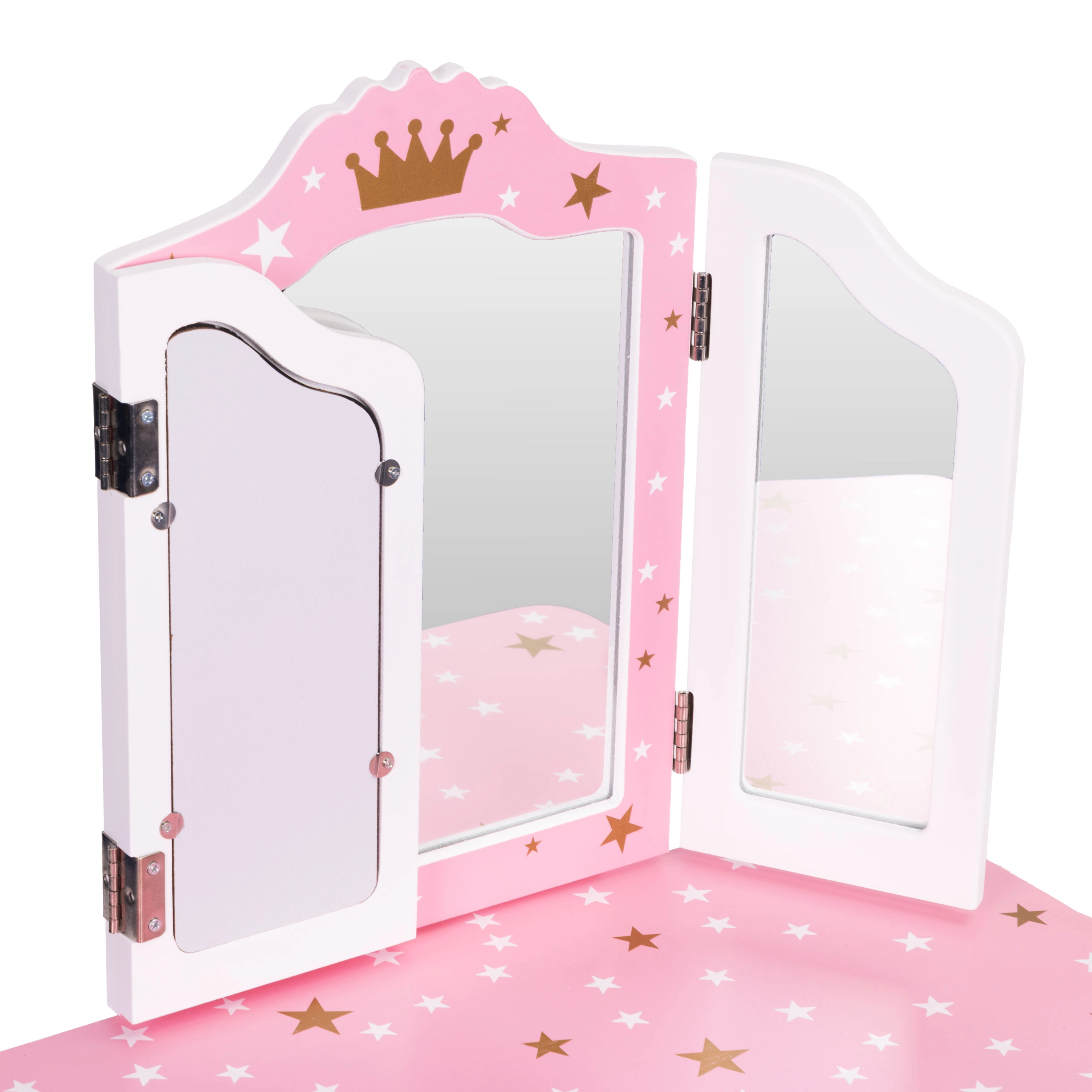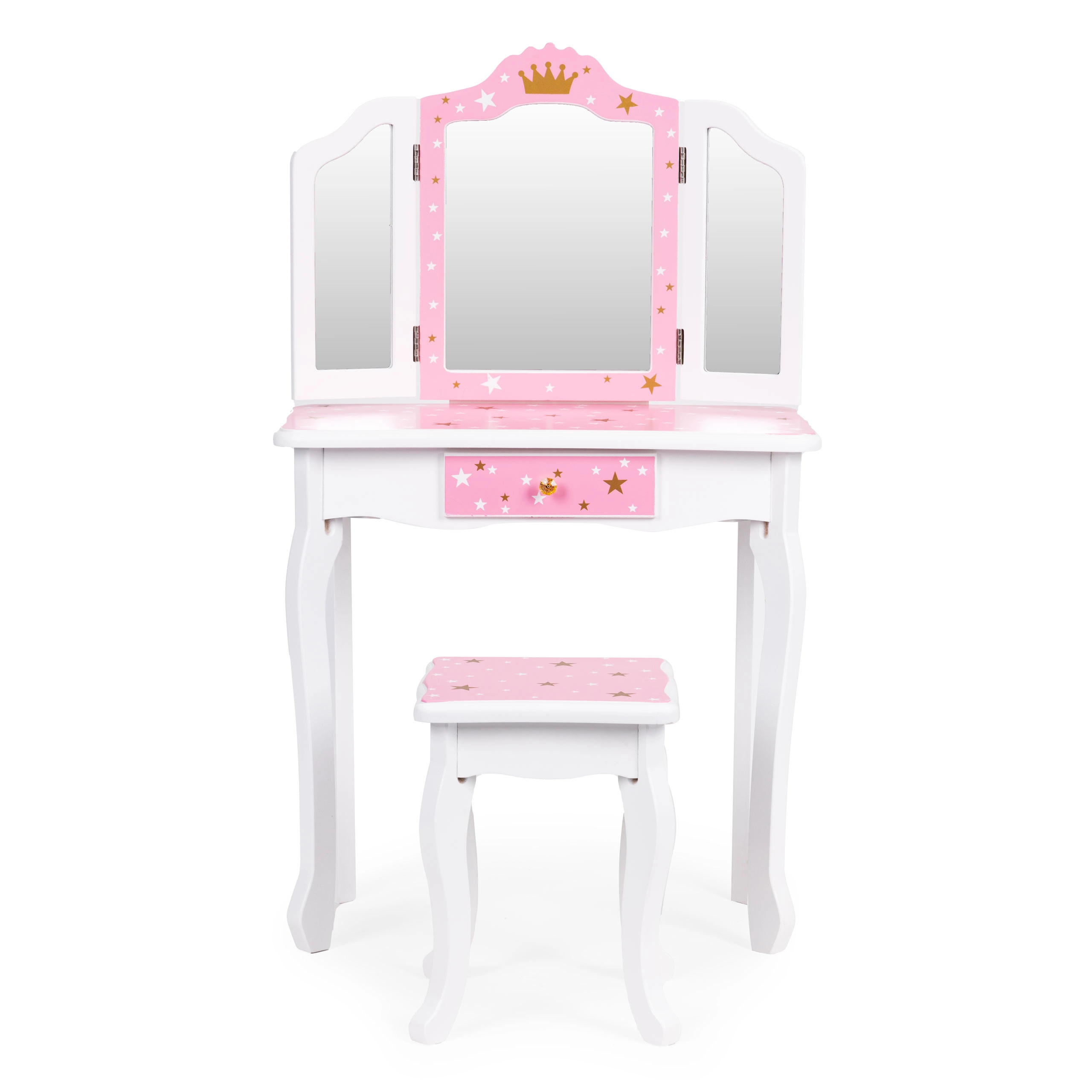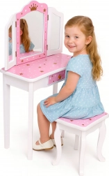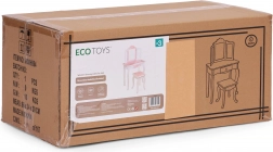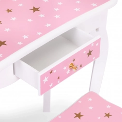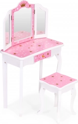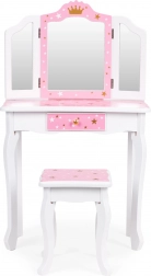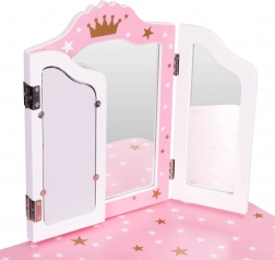 Créez un coin beauté magique dans la chambre des enfants. La coiffeuse ECOTOYS allie fonctionnalité et design féerique : un grand miroir central complété par deux volets latéraux rabattables pour une vue sous différents angles, tandis que le tiroir pratique dissimule barrettes, élastiques et accessoires pour enfants. L’ensemble est complété par un tabouret stable assorti au design.