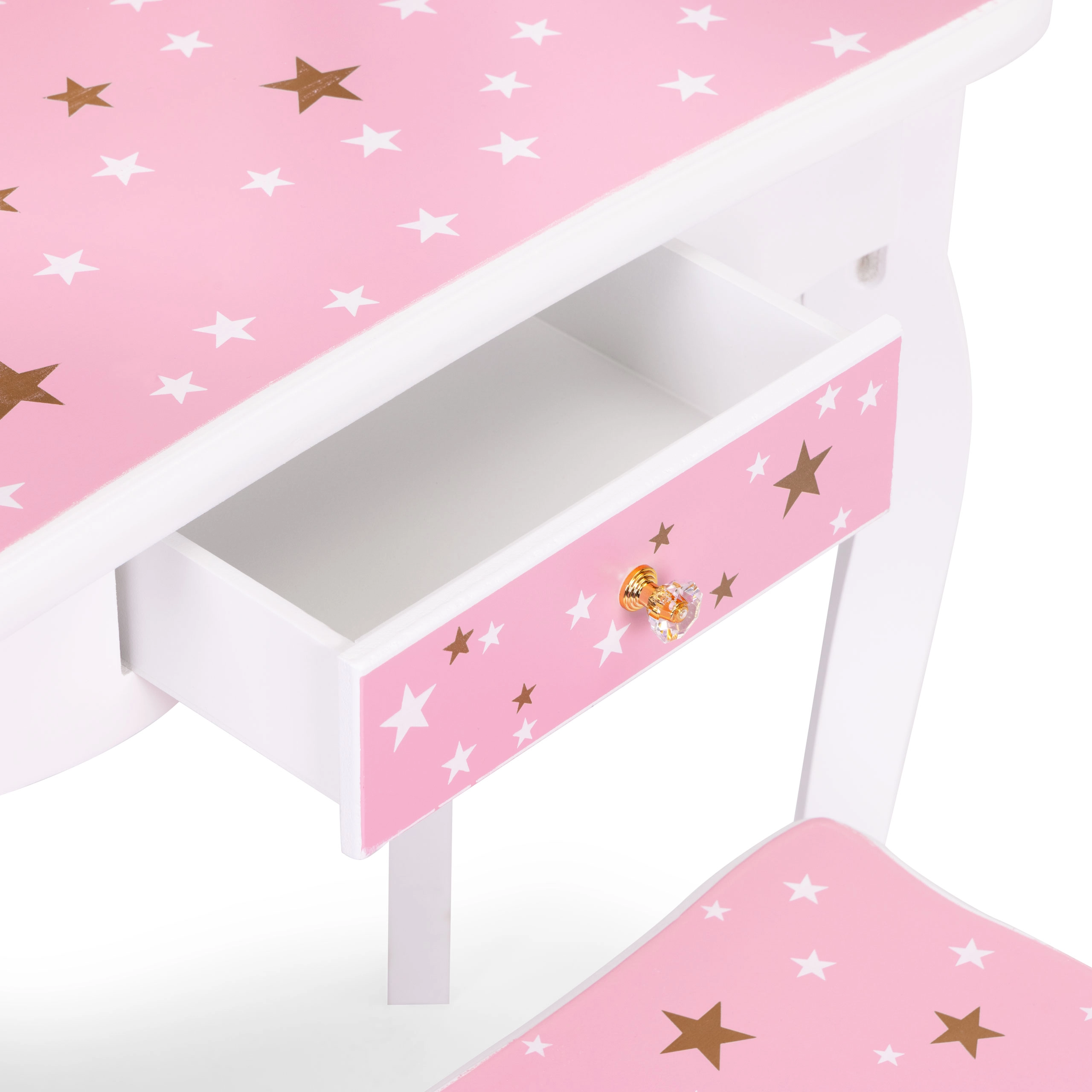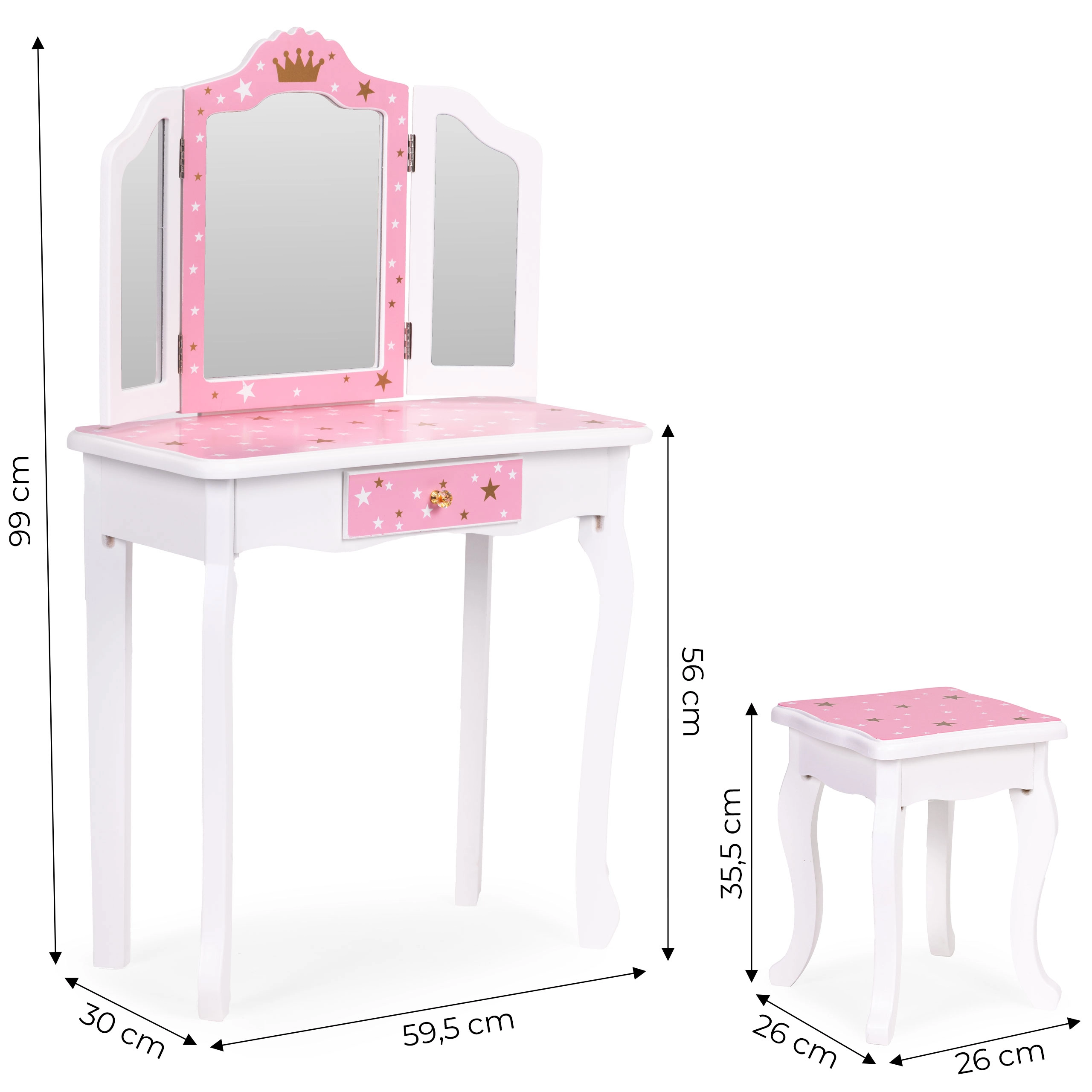 Grâce au bois de qualité et au MDF, la coiffeuse est solide et durable. Elle favorise la motricité fine, la coordination œil‑main et l’autonomie lors des jeux quotidiens « salon de beauté » ou « princesse ». Le rose discret avec motifs d’étoiles et de couronne s’intègre à la plupart des intérieurs.